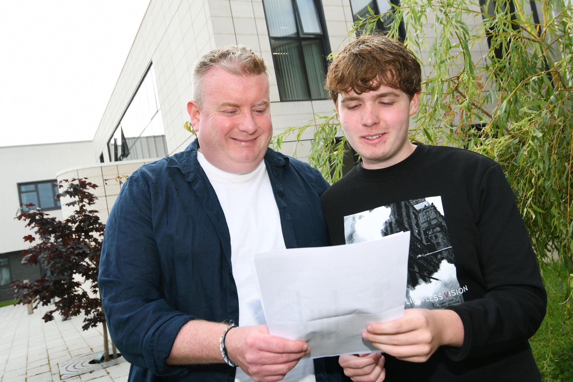 Jack Hamilton showing his GCSE Level results to his dad, Chris, at Foyle College on Thursday morning.