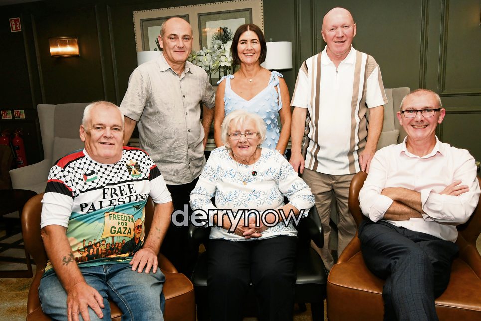 Mary Nelis pictured with her children, from left, Paddy, Frank, Cathy, John and Declan, during her 90th birthday celebrations at the Ebrington Hotel.