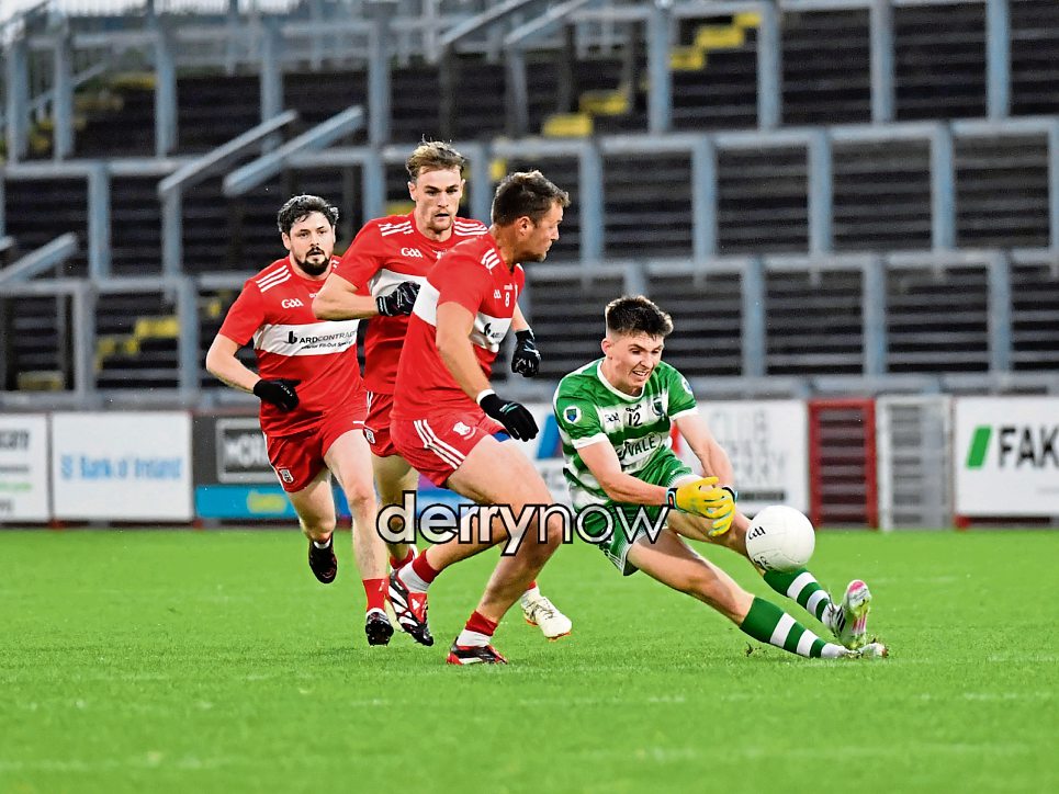 Drumsurn players converge on Faughanvale’s Shea Martin.