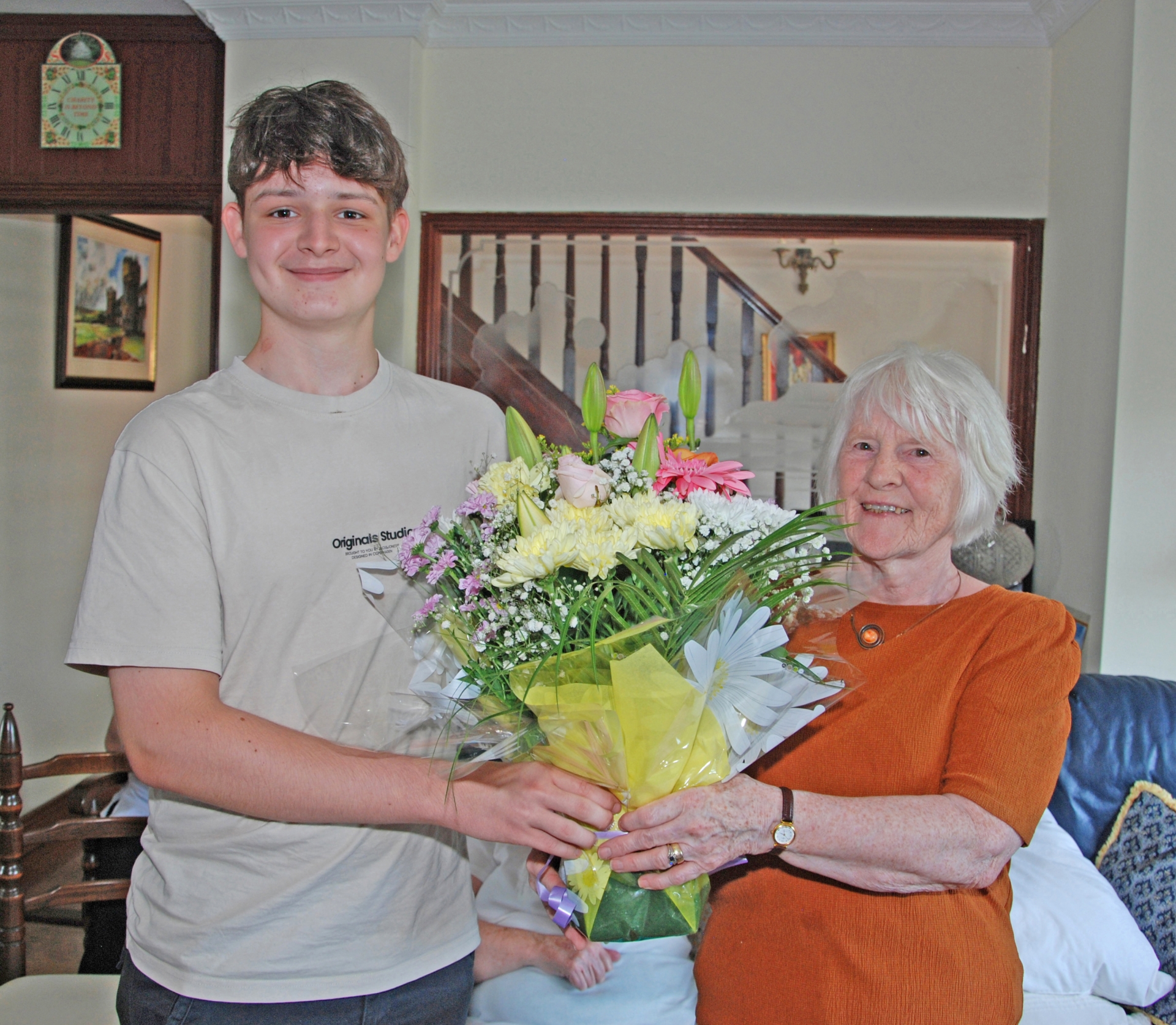 Owen Mor Care Centre volunteer, Matthew Hynds, presents Mary Conway with a bouquet of flowers for her fundraising work.