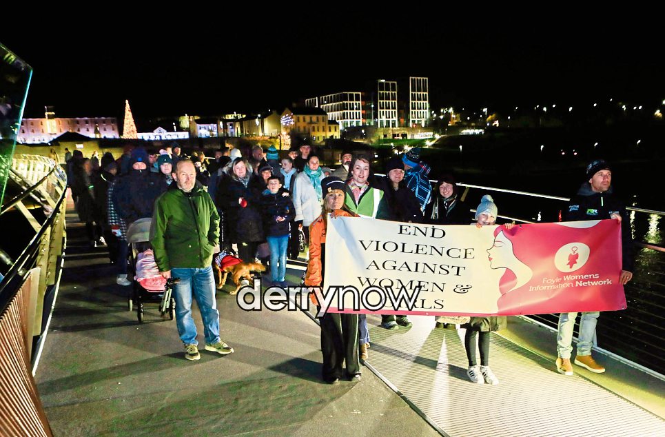 Group crossing the Peace Bridge at the Reclaim the Night march from Ebrington Square to Guildhall Square on Saturday night. (Photos - Tom Heaney, nwpresspics)
