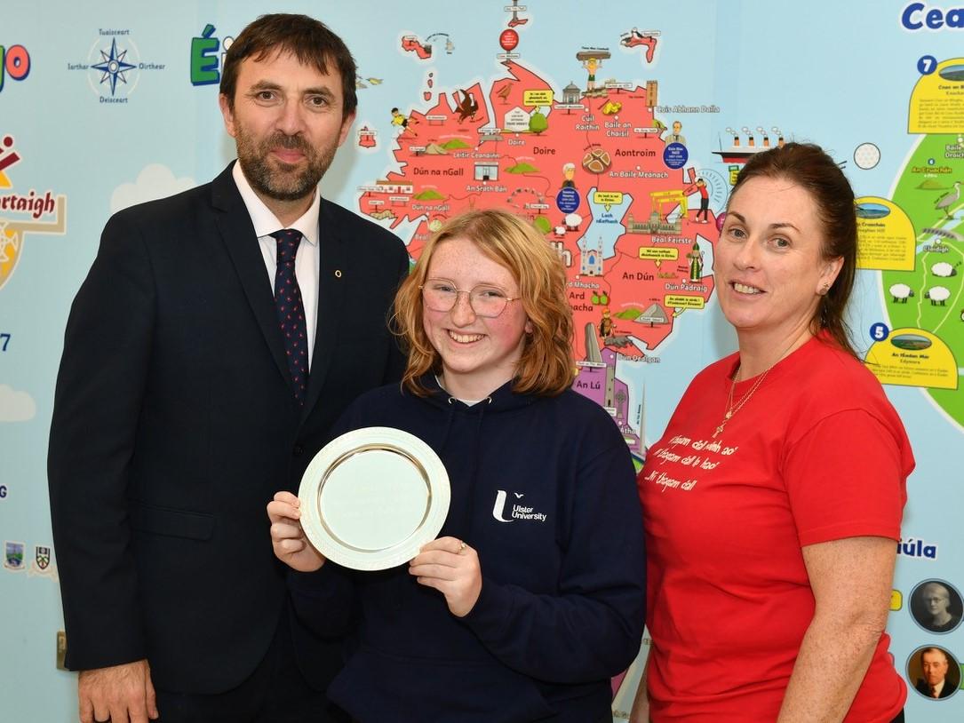 PICTURED ABOVE: A level pupil Aoibe Nic Giolla Bhuí attained 100% of marks in A Level Irish and was presented with her prize in her former bunscoil, Gaelscoil Uí Dhochartaigh, Strabane. She is now studying Optometry at Ulster University.