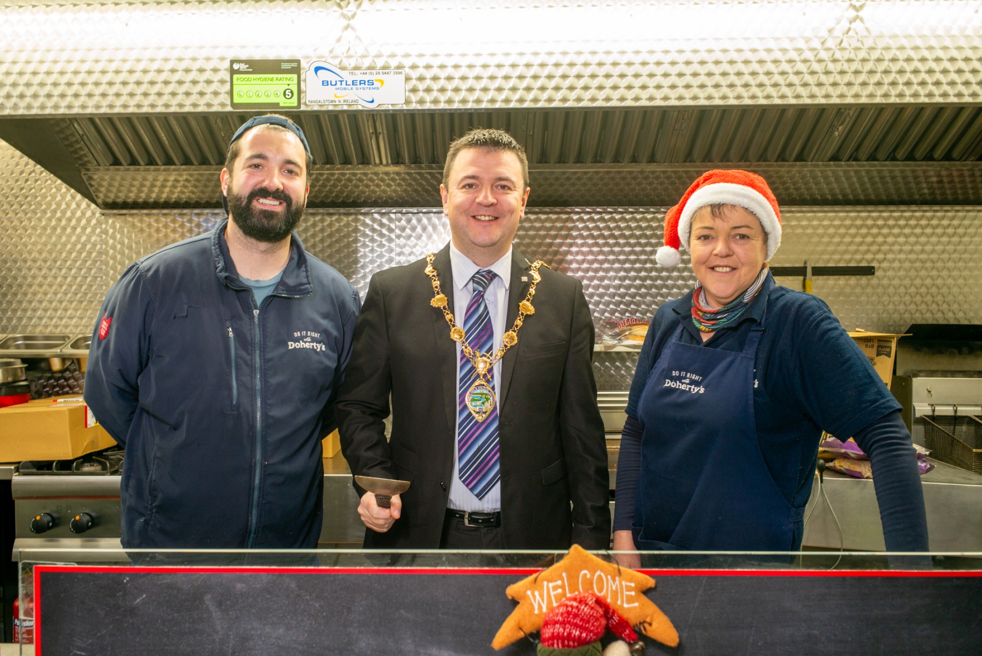 Conor and Margaret from Doherty's Street Kitchen, with the Mayor at Strahans Road Recycling Centre.
