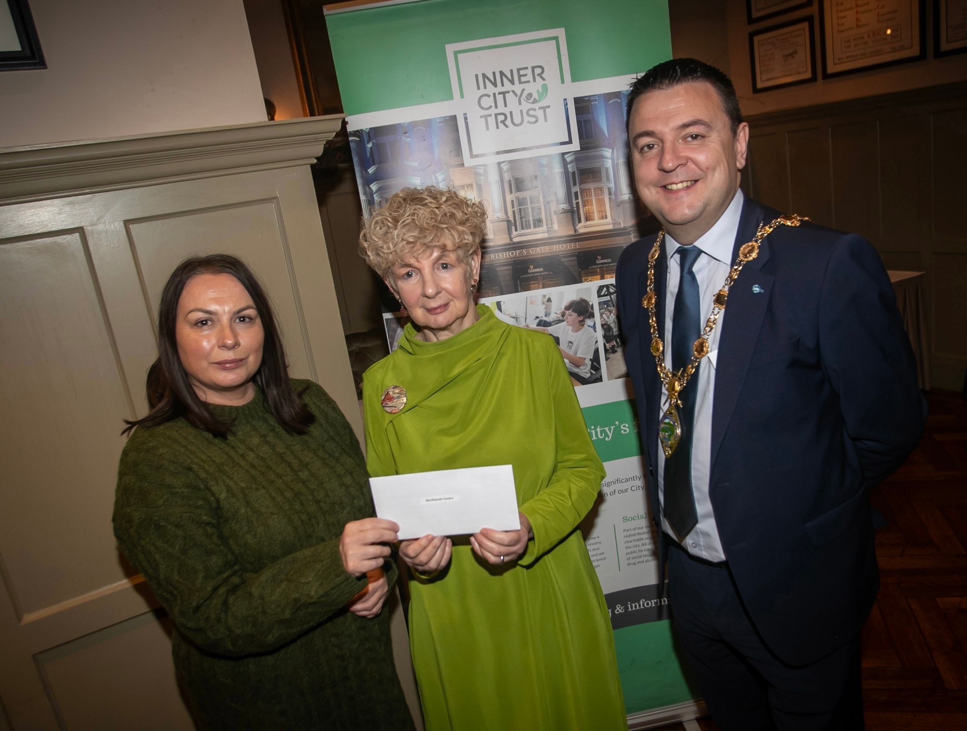 Bernie Williamson from the Northlands Centre accepting a cheque from Philly Melaugh, Inner City Trust at Thursday's ICT Annual Giving event held at the Bishop's Gate Hotel. On right is Mayor, Ruairi McHugh.