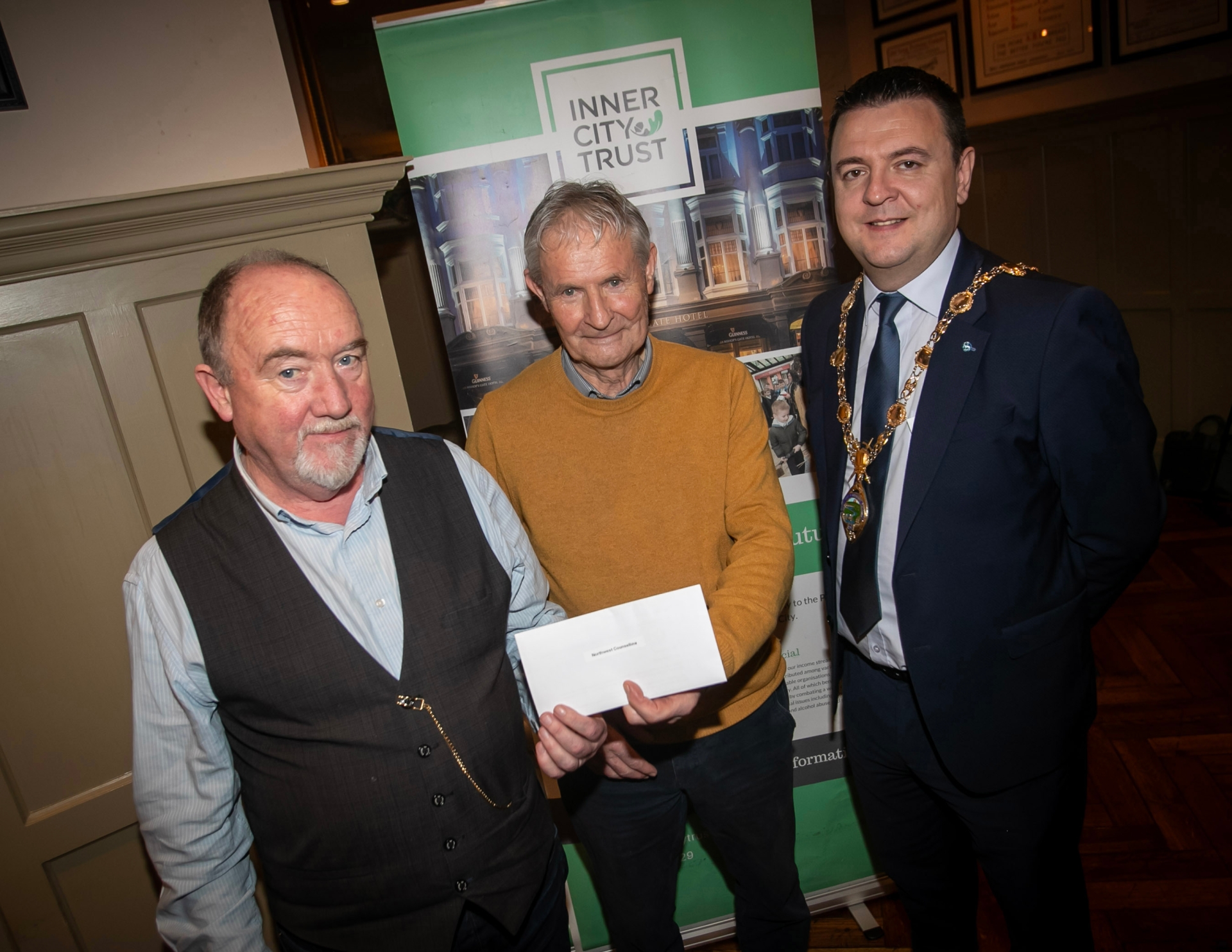 Raymond Craig from North West Counselling accepting a cheque from Pat Walsh, Inner City Trust at Thursday's ICT Annual Giving event held at the Bishop's Gate Hotel. On right is Mayor, Ruairi McHugh. (Photos: Jim McCafferty Photography)