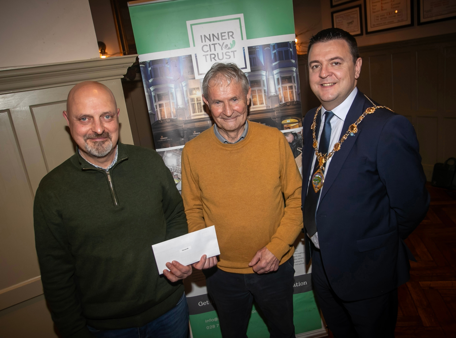 Darren McParland from Depaul Ireland accepting a cheque from Pat Walsh, Inner City Trust at Thursday's ICT Annual Giving event held at the Bishop's Gate Hotel. On right is Mayor, Ruairi McHugh.