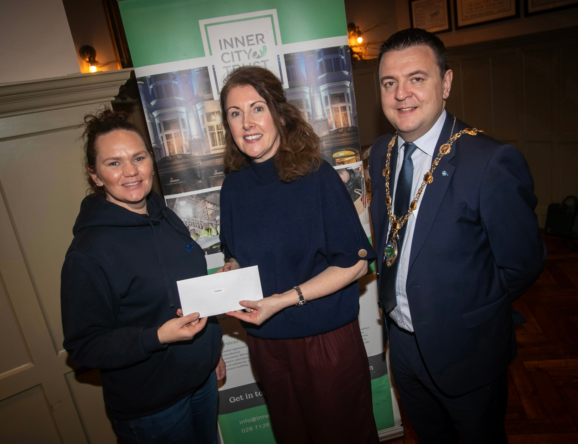 Caroline Temple from Youthlife accepting a cheque from Maria McGilloway, Inner City Trust at Thursday's ICT Annual Giving event held at the Bishop's Gate Hotel. On right is Mayor, Ruairi McHugh.