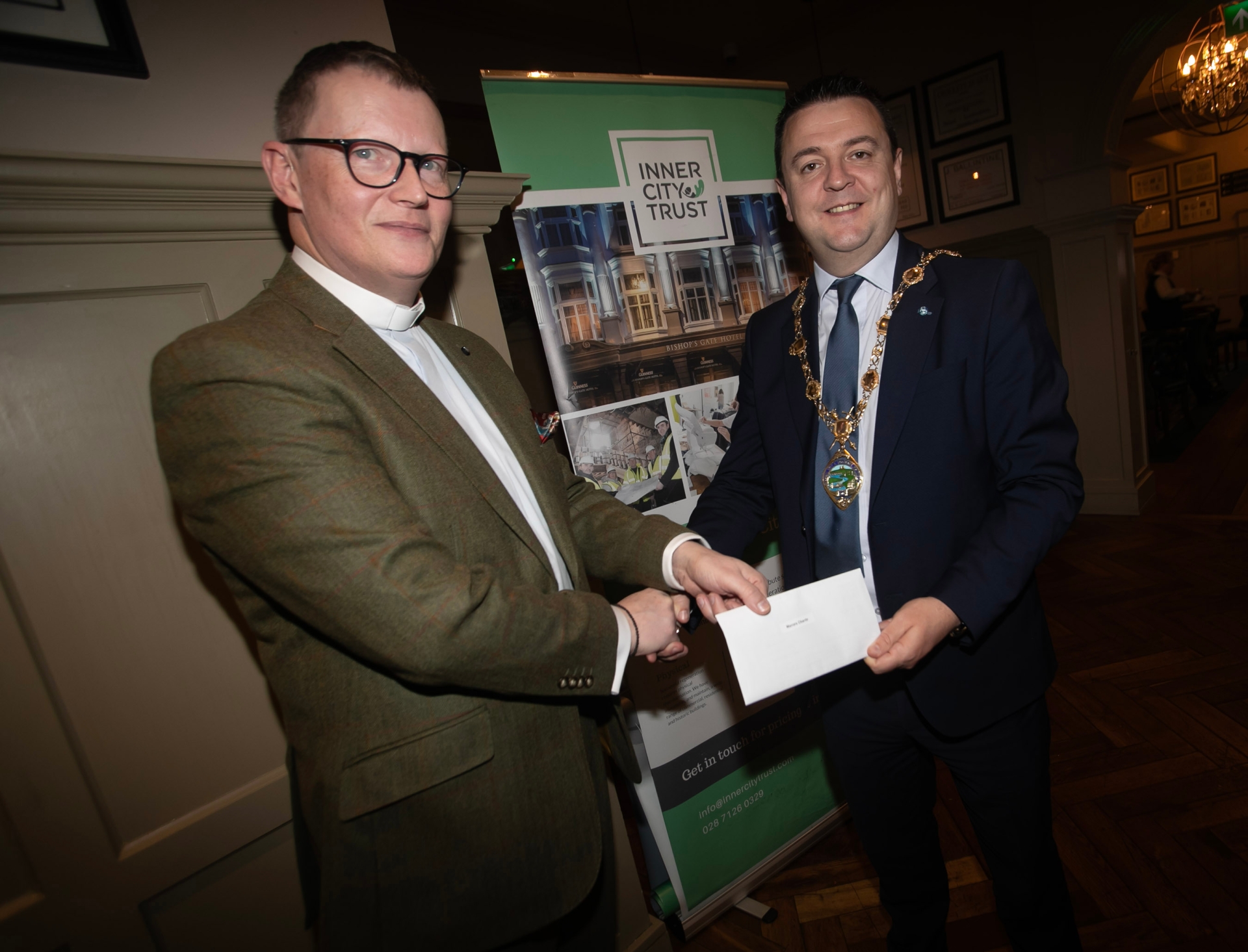The Rev. Robert Miller, chair, Inner City Trust, presenting a cheque to the Mayor, Ruairi McHugh for his chosen charity at Thursday's ICT Annual Christmas Giving event at the Bishop's Gate Hotel.