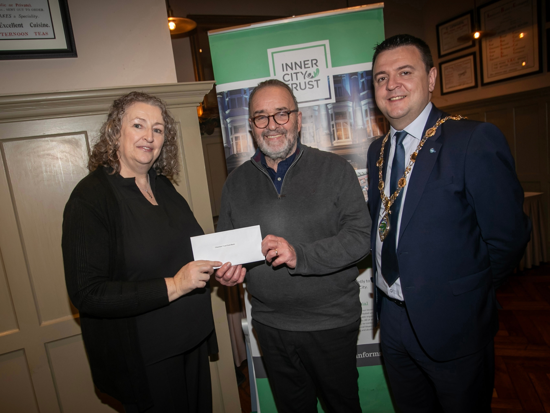 Mary Holmes, CEO, Churches Trust accepting a cheque from John Meehan, Inner City Trust at Thursday's ICT Annual Giving event held at the Bishop's Gate Hotel. On right is Mayor, Ruairi McHugh. (Photos: Jim McCafferty Photography)