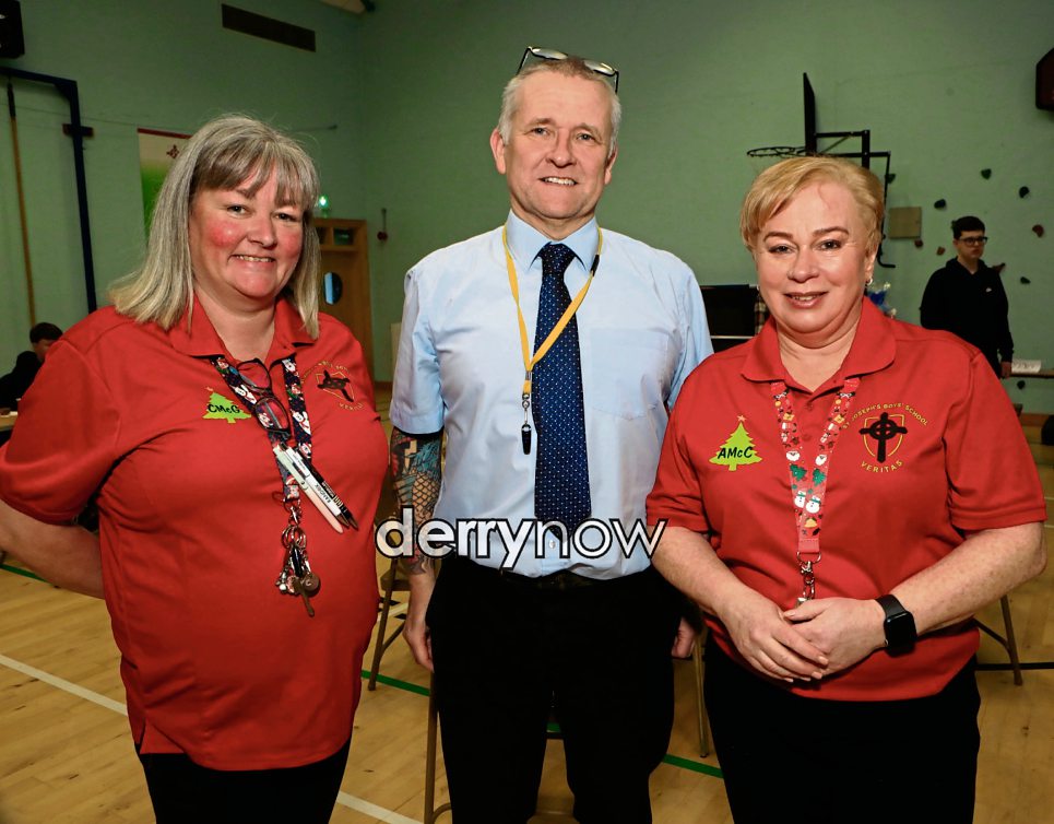 Gerry McBride with on left Christina McGinley and Annette McCallion, organisers of the Olive Branch for Gaza fundraiser held in St. Joseph's Boys' School.
