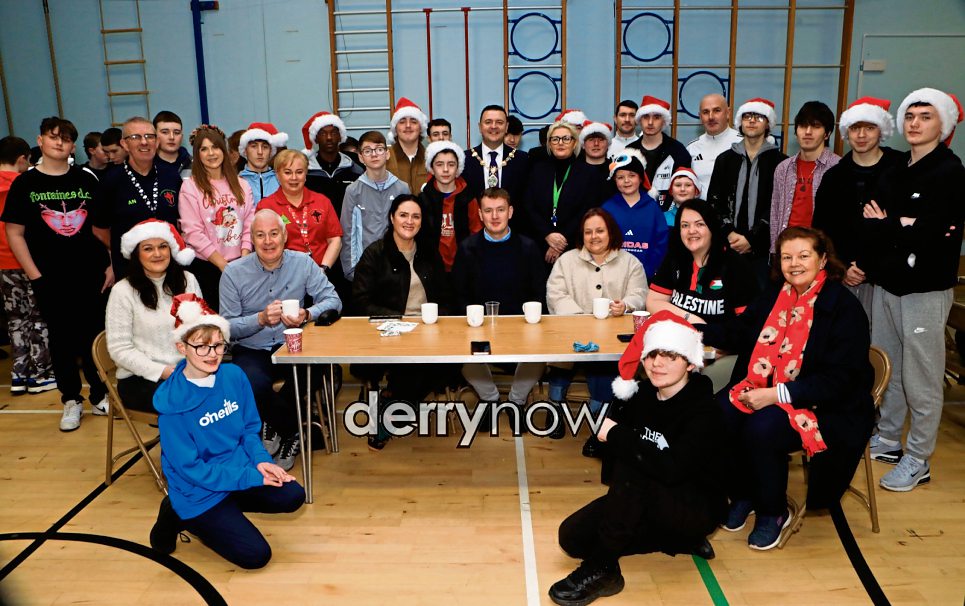 Mayor Ruairi McHugh with Ciara Deane, principal, staff, pupils and local politicians at the Olive Branch for Gaza fundraiser held in St. Joseph's Boys' School. (Photos - Tom Heaney, nwpresspics)