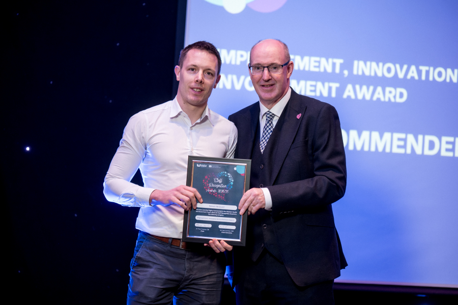 Nessan McQuaid, Arthroplasty Practitioner, Altnagelvin Hospital, highly commended in the Improvement, Innovation and and Involvement Award category, is presented with his award by Neil Guckian, Chief Executive.
