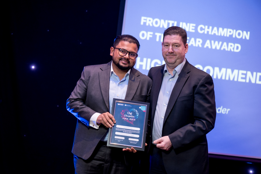 Dr Ashish Alexander, Speciality Doctor/Anaesthetist, Altnagelvin is presented with the highly commended Frontline Champion of the Year award by Dr Brendan Lavery, Medical Director.