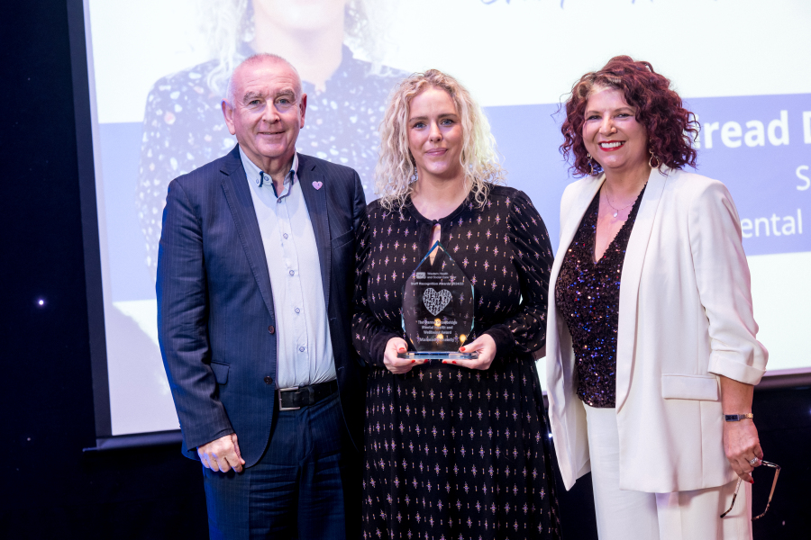 Dr Tom Cassidy, Director of Children & Family Services and Karen O’Brien, Director of Adult Mental Health & Disability Services present the inaugural Darren Strawbridge Mental Health and Wellbeing Award to Mairead Donnelly, Social Worker, Adult Mental Health & Disability Services, Old Bridge House, Derry.