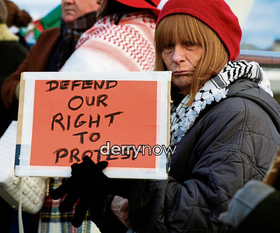 A woman holding a placard at the Peace Vigil for Palestine held on the Peace Bridge on New Year's Eve. (Photos - Tom Heaney, nwpresspics)