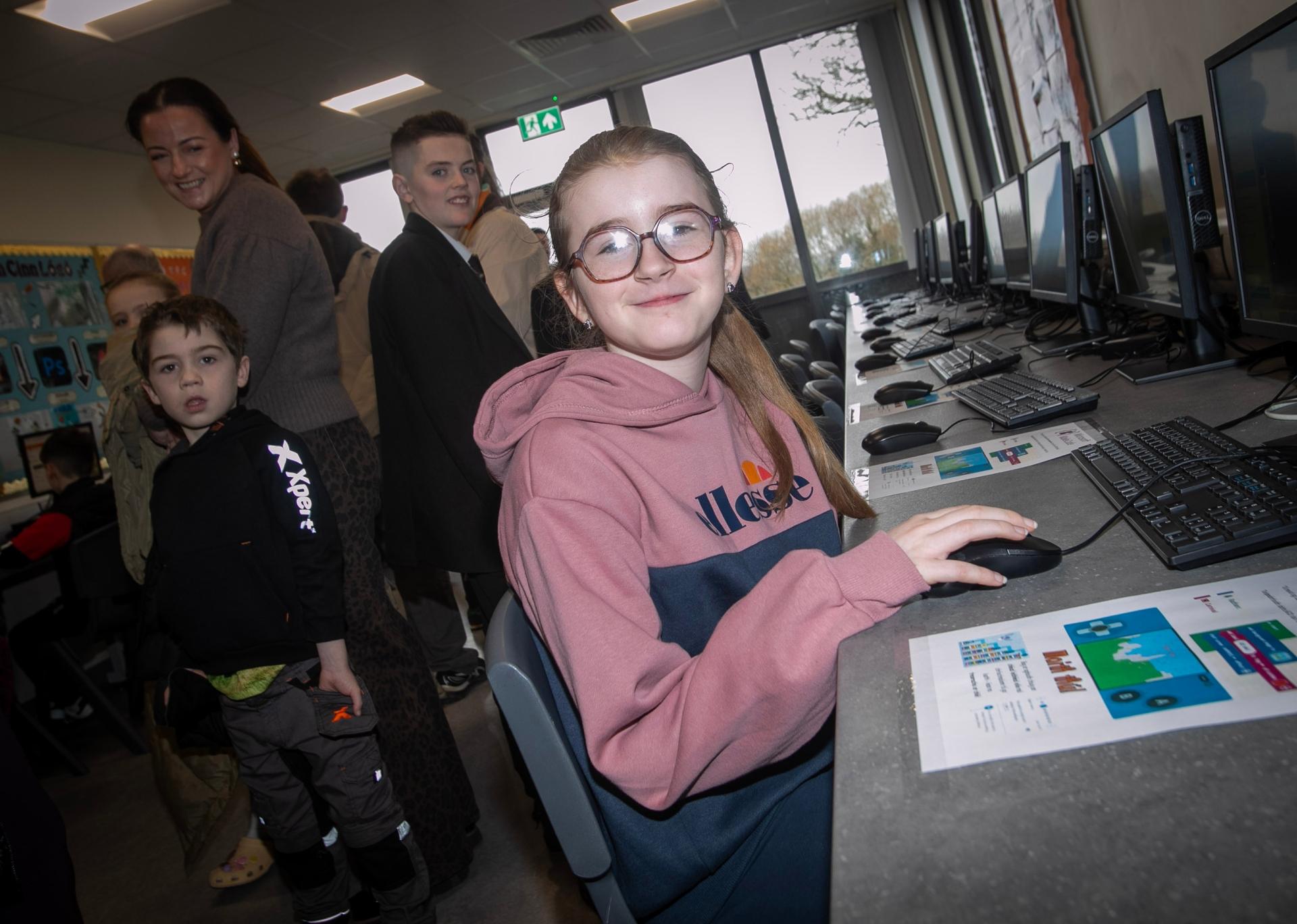 A big smile from P7 Bunscoil Naoibh Brid pupil Shannon having fun in the ICT Suite at Gaelcholaiste Dhoire on Saturday.