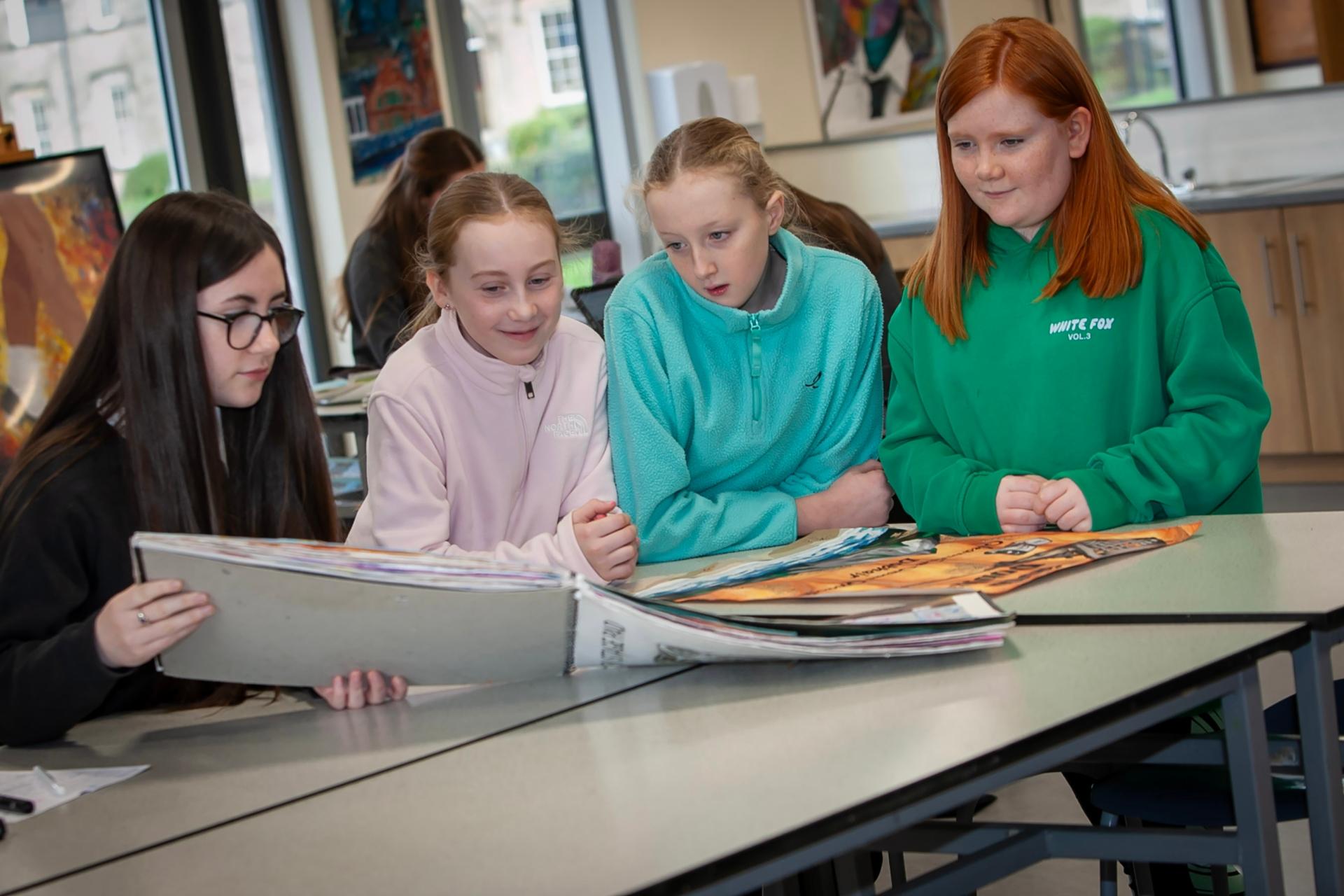 Prospective students from Bunscoil Naomh Brid - Teresa, Aoife and Cayla in conversation with art student Laoise on Saturday.