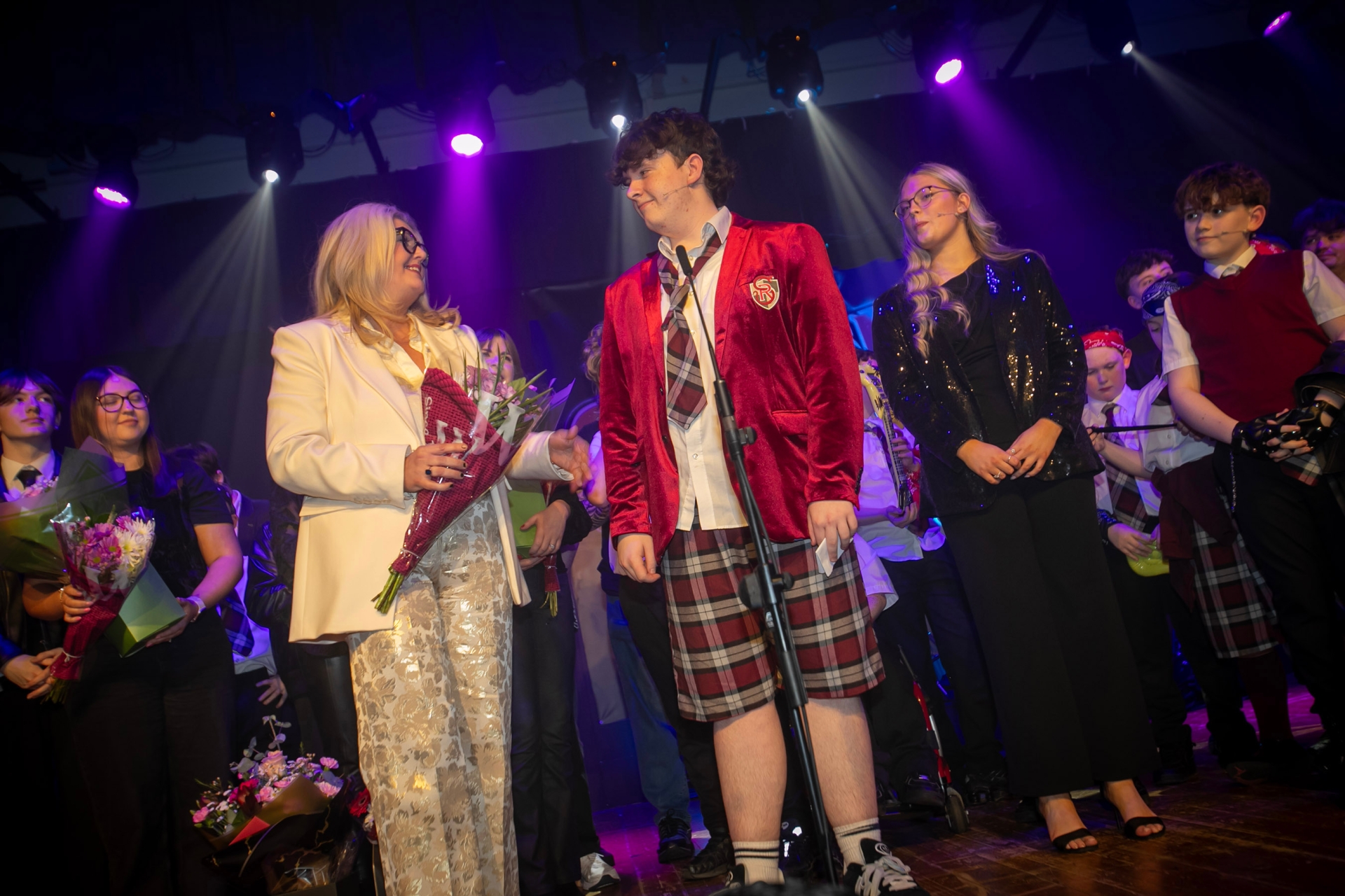 School Princpal Mrs. CIara Deane is presented with a bouquet of flowers on Thursday night.