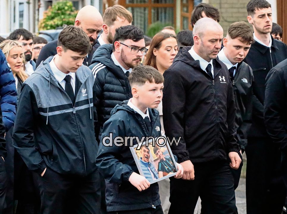 A relative carrying a framed photo as the funeral cortege of road traffic accident victim, Daniel Cullen makes its way to Our Lady of Lourdes Church, Steelstown.