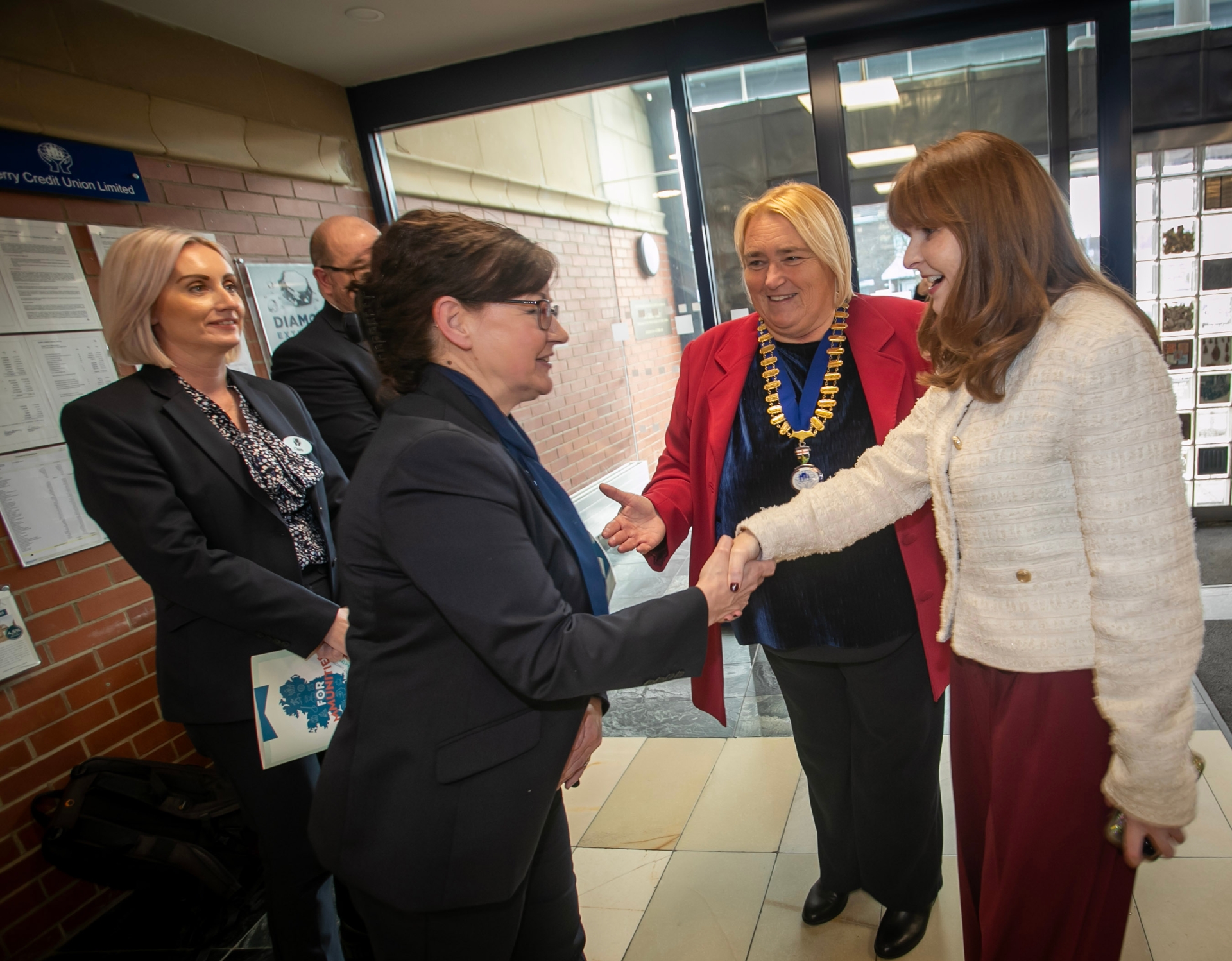Minister for the Economy Dr. Caoimhe Archibald being introduced to Karen Doran, Finance Manager,, Derry Credit Union during Thursday's visit.