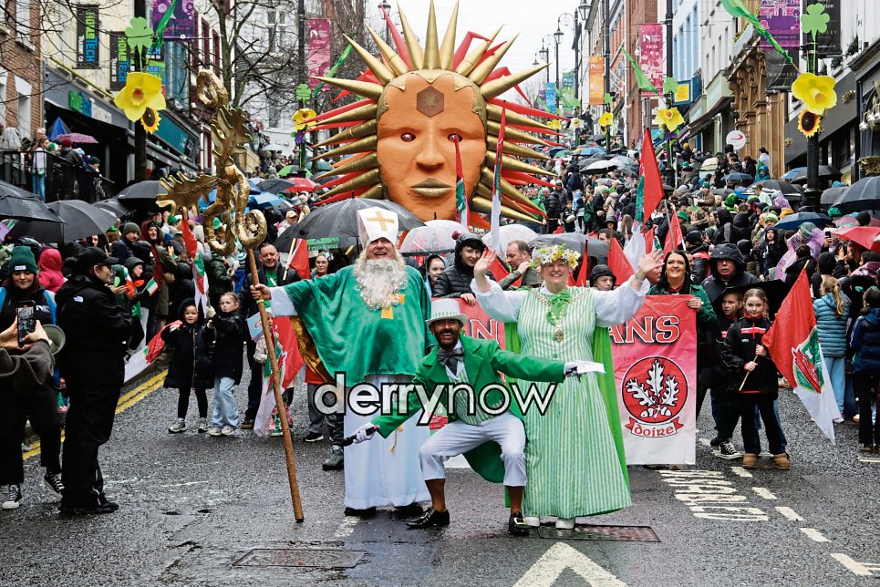 Local celebrity Mickey Doherty and Deputy Mayor Niree McMorris with St. Patrick, leading the St. Patrick’s Day Parade coming down Shipquay Street.