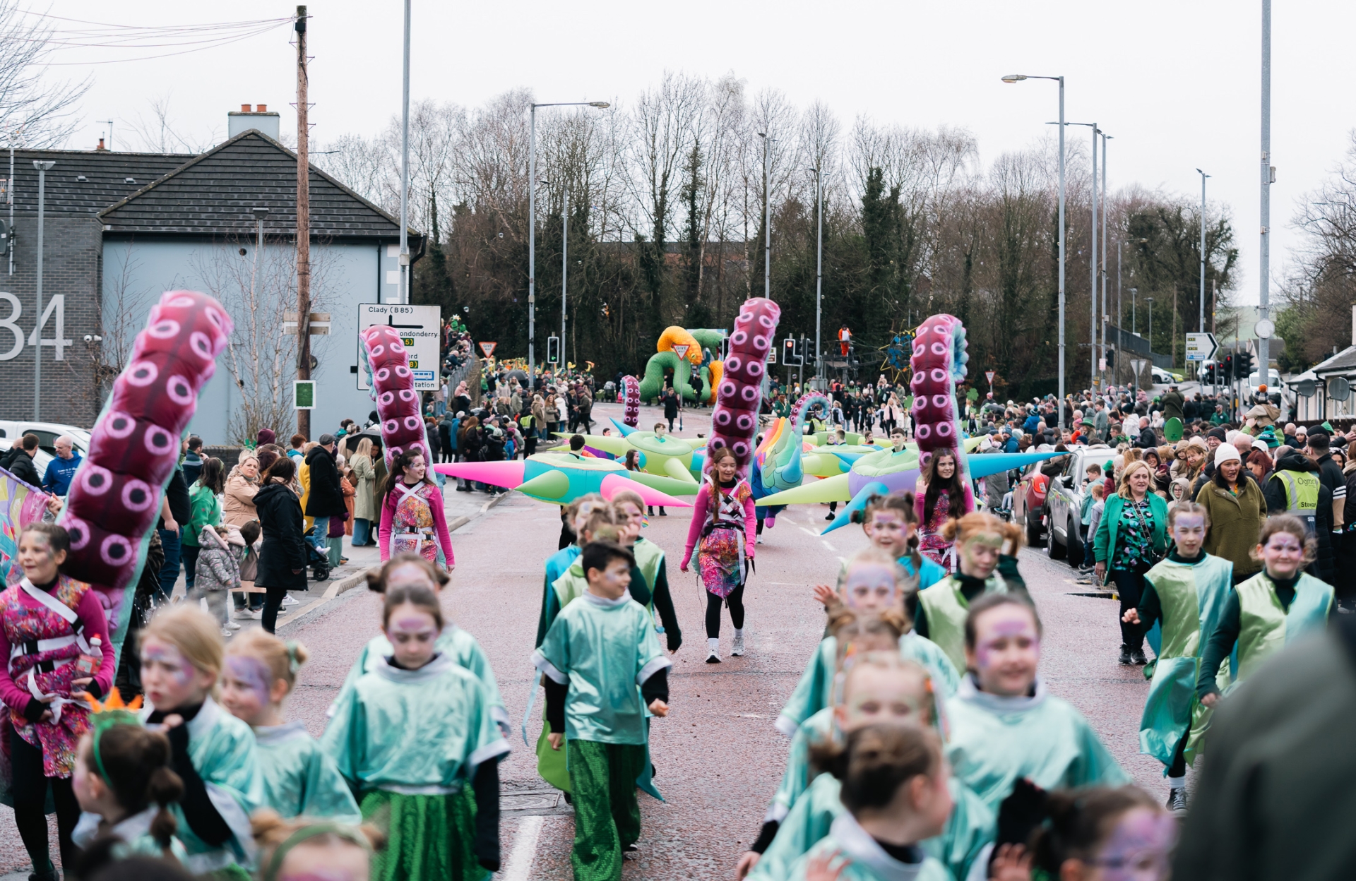 The procession moves through Bridge Street as onlookers gather to enjoy the festivities.