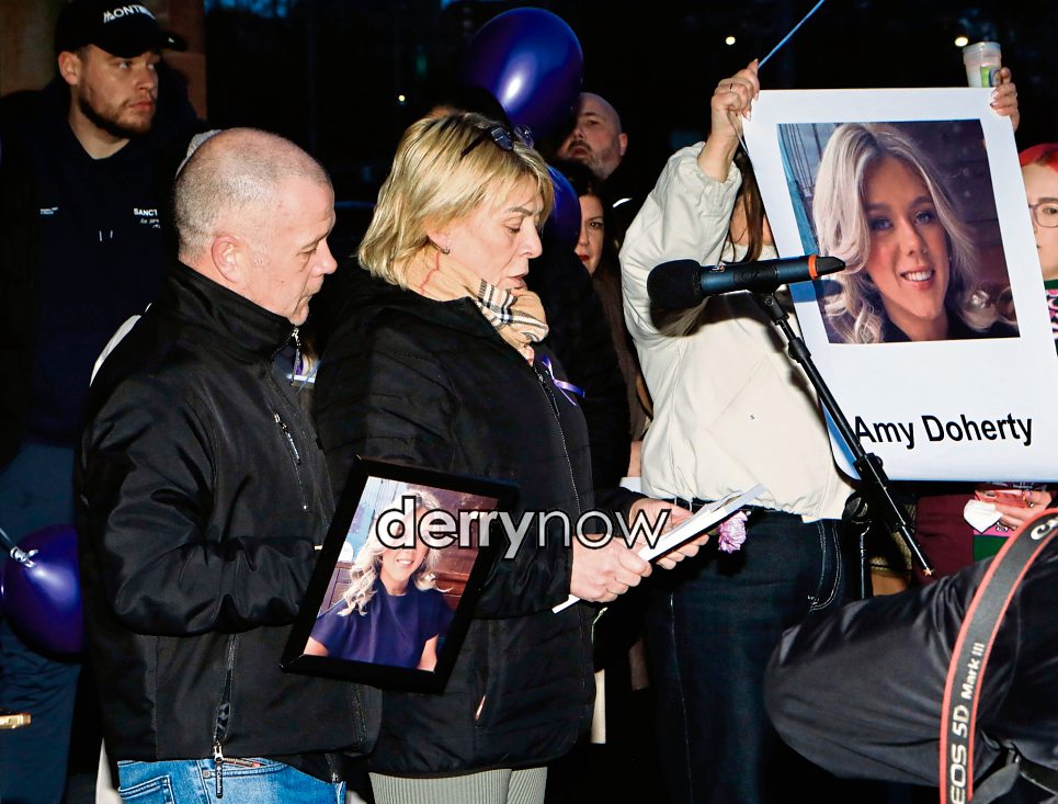 Sharon Doherty, the mother of murdered victim Amy Doherty speaking at the vigil in the Guildhall Square on Friday night.