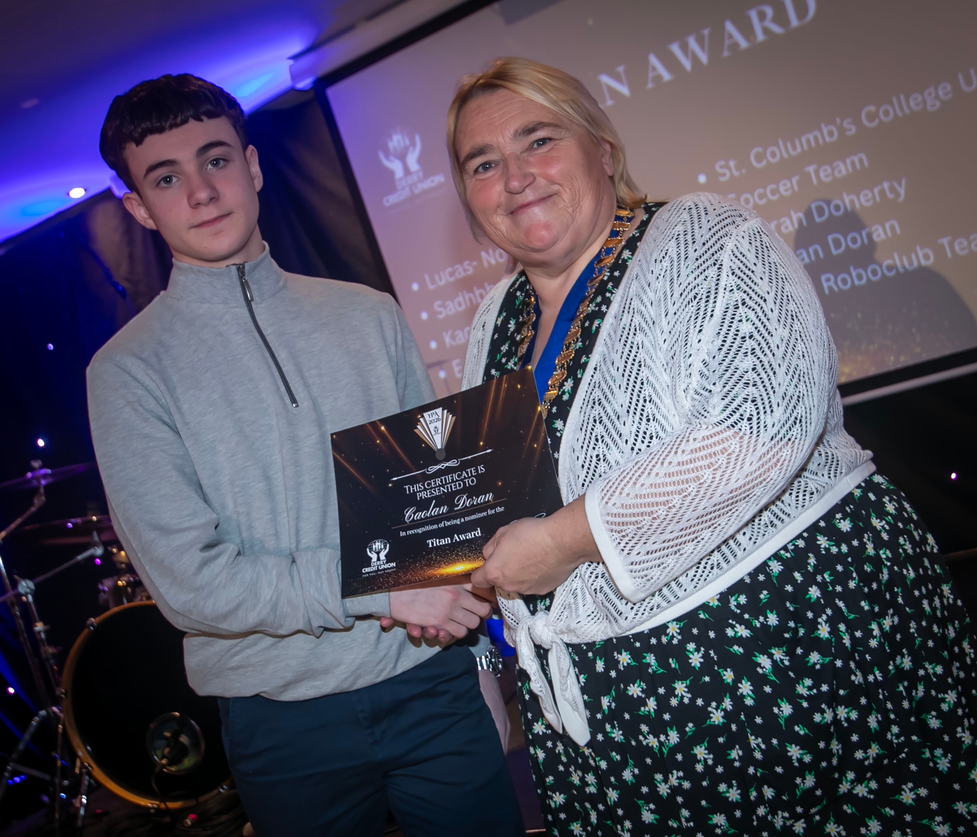 Caolan Doran receiving his 'Titan Award' certificate from Delma Boggs, President, Derry Credit Union.