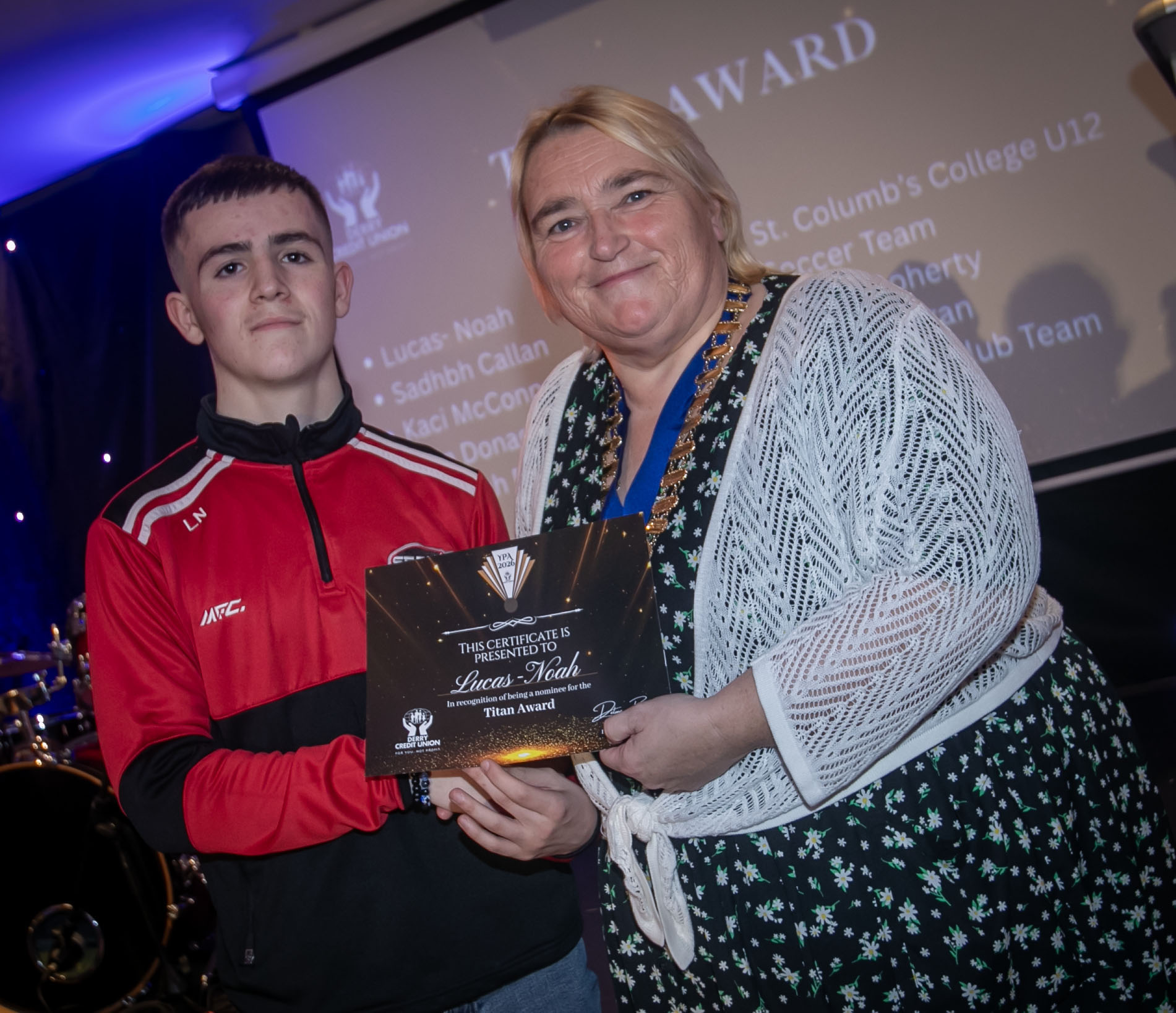 Lucas Noah receiving his 'Titan Award' certificate from Delma Boggs, President, Derry Credit Union.