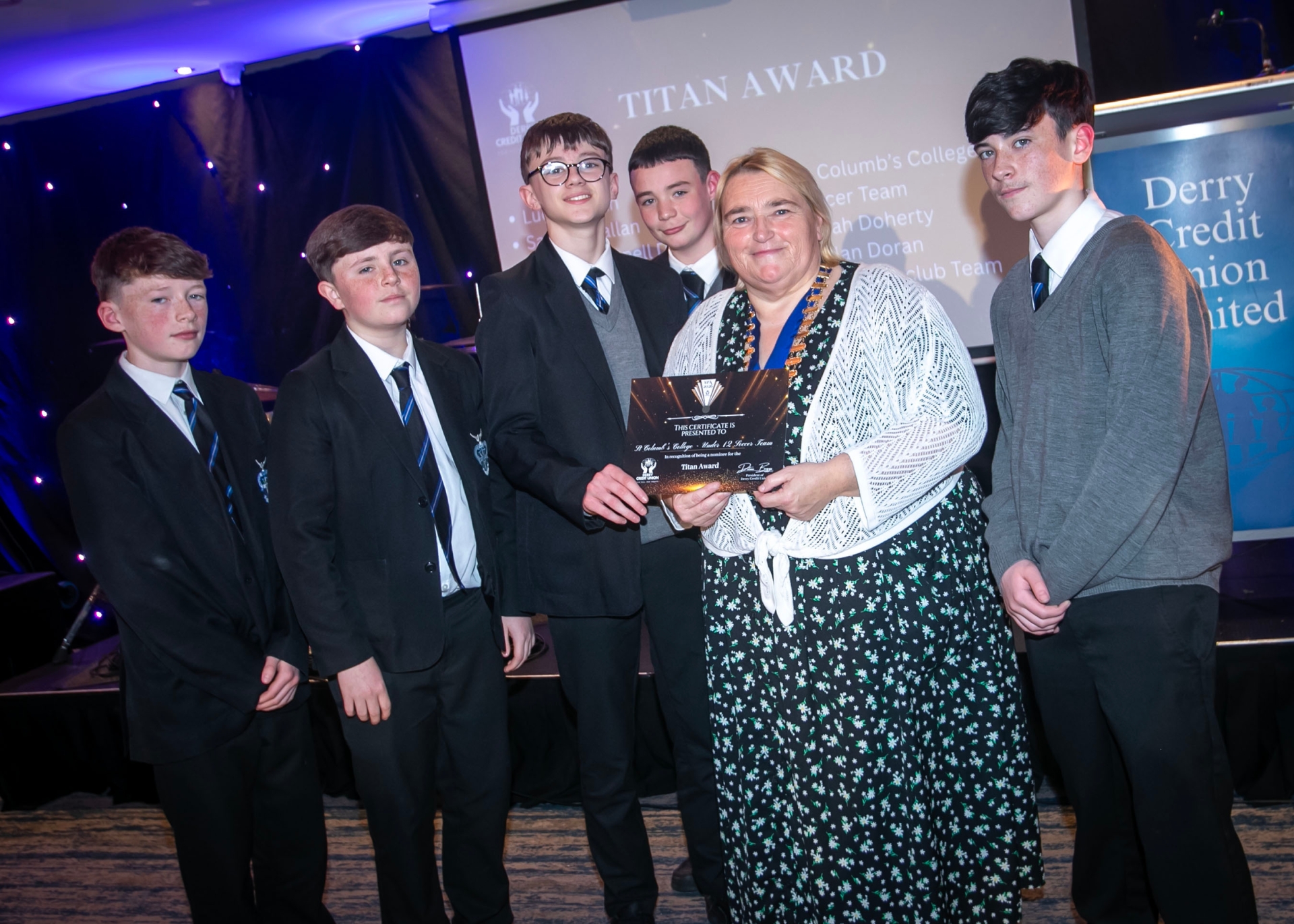 Representatives from the St. Columb's College u-12 soccer team receiving their 'Titan Award' certificate from Delma Boggs, President, Derry Credit Union.