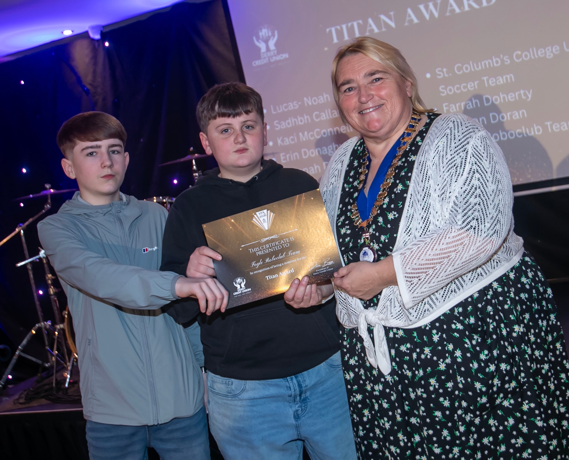 Representatives from the Foyle Roboclub Team receiving their 'Titan Award' certificate from Delma Boggs, President, Derry Credit Union.