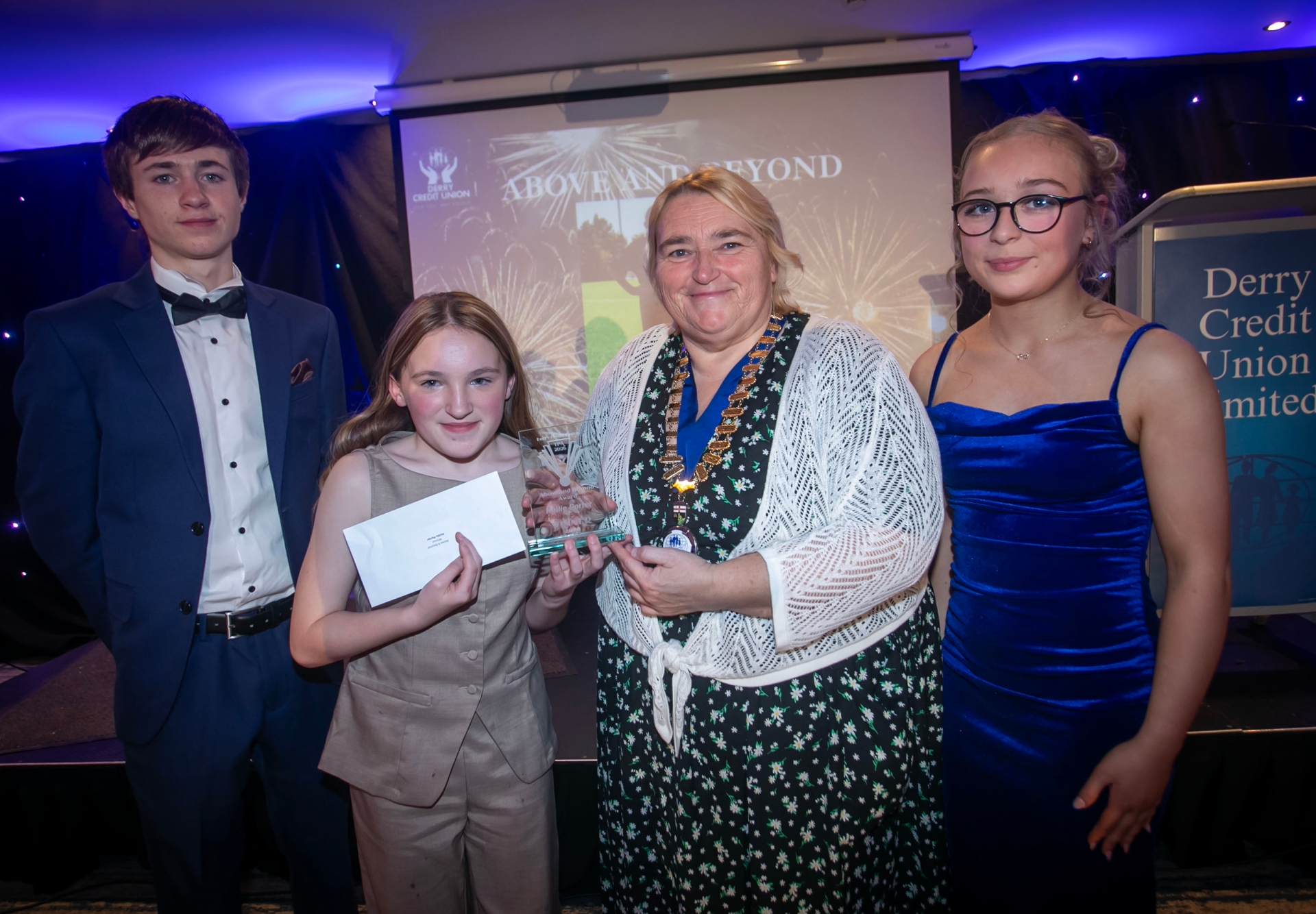 Hollie Porter receiving the 'Above and Beyond' award from Delma Boggs. Included are Buadan Harkin and Orlaith Wilson, Youth Committee.