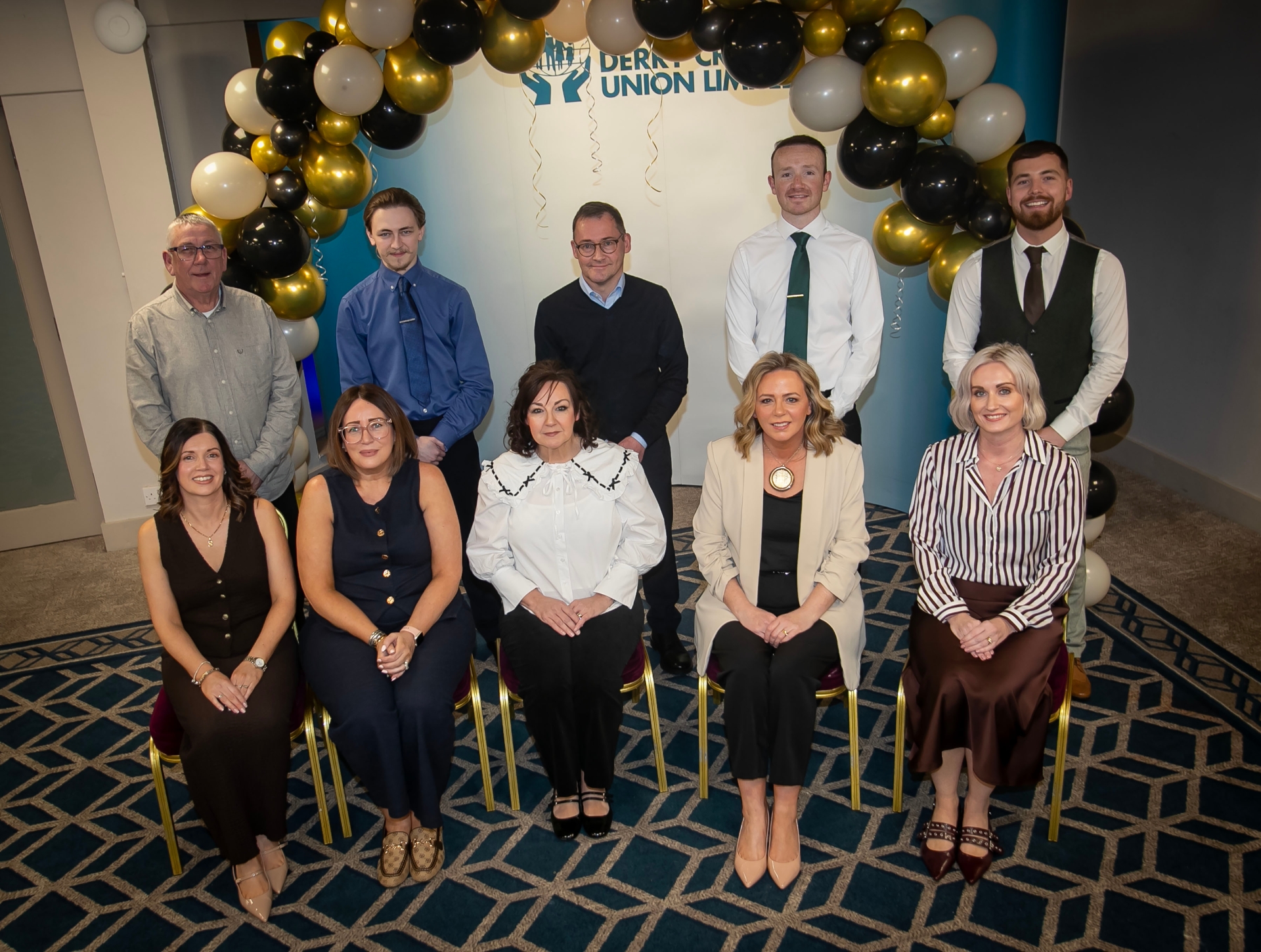 Derry Credit Union management and staff pictured at Monday night's 'Young People's Awards 2026' in the Waterfoot Hotel, Derry. Front from left, Sinead, Geraldine, Karen Doran, Sharon Doherty and Clare McLaughlin. Back from left Gerry Reddin, Kevin McCauley, CEO, Ciaran McCormick, Education Officer and John Sheerin.. (Photos: Jim McCafferty Photography)