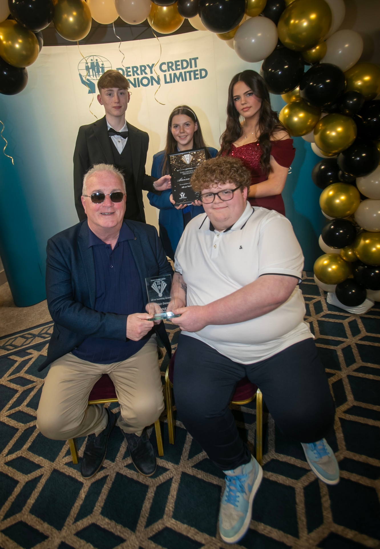 Richard Moore, founder, Children in Crossfire, special guest speaker, presenting Tristan Doran with the 'All or Nothing'' award at the Derry Credit Union's Young People's Awards, 2026 at the Waterfoot Hotel on Monday night. At back is Alannah Gormley, runners-up receiving her certificate from Gary McLaughlin and Alannah Doherty, DCU Youth Committee.
