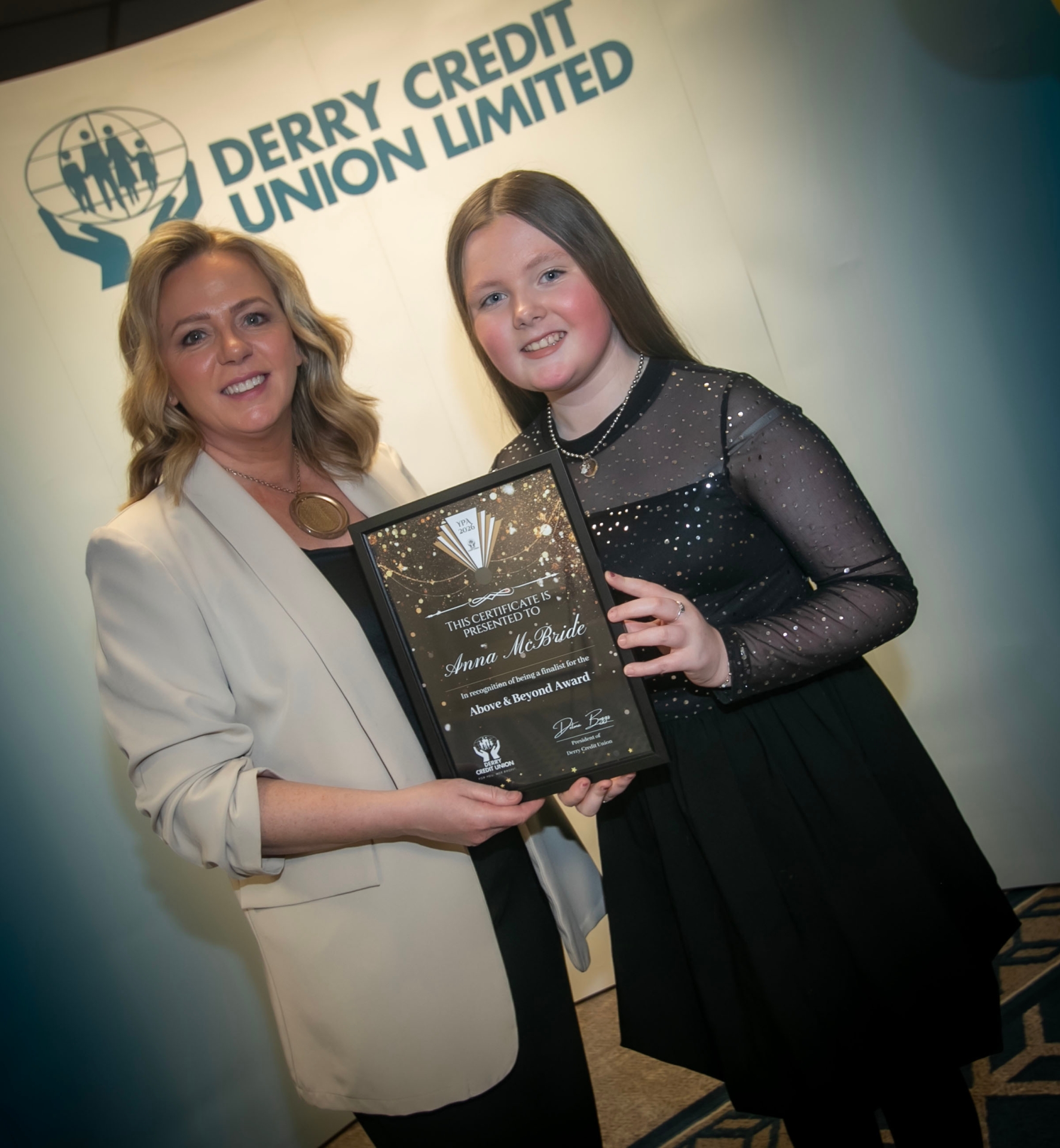 Derry Credit Union's Sharon Doherty presenting Anna McBfride with her 'Above and Beyond' certificate at Monday's event.