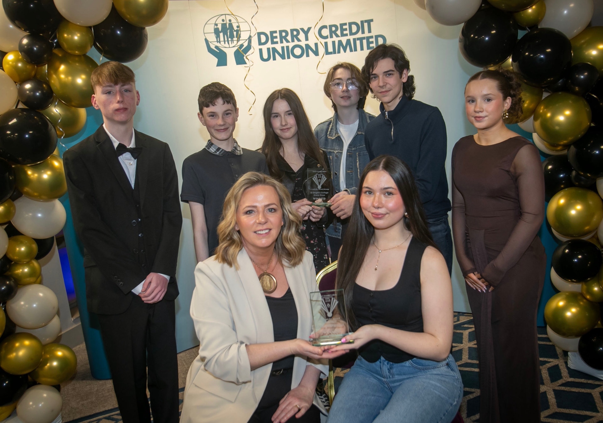 Sharon Doherty, Derry Credit Union presenting joint winners Mila McFarland and St. Brigid's College Drama Club with the 'Creativity Awards' at the Derry Credit Union's Young People's Awards, 2026 at the Waterfoot Hotel. At back are runners up James McBride, Grace Kavanagh and Aideen Mullan receiving their certificates from Ryan McLaughlin and Emily Bell, DCU Youth Committee.