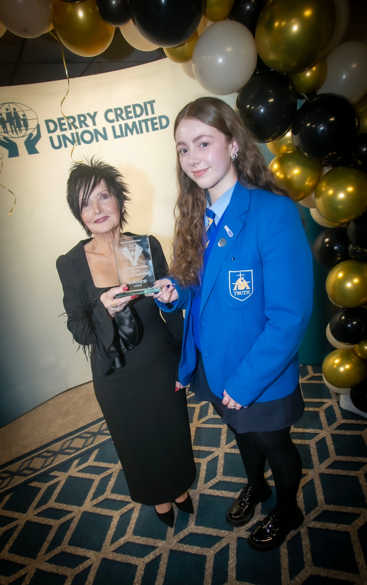 Patricia Doherty, Vice President, Irish League of Credit Unions presenting the 'Entrepreneurship Award to Eimear McGowan, St. Mary's College.