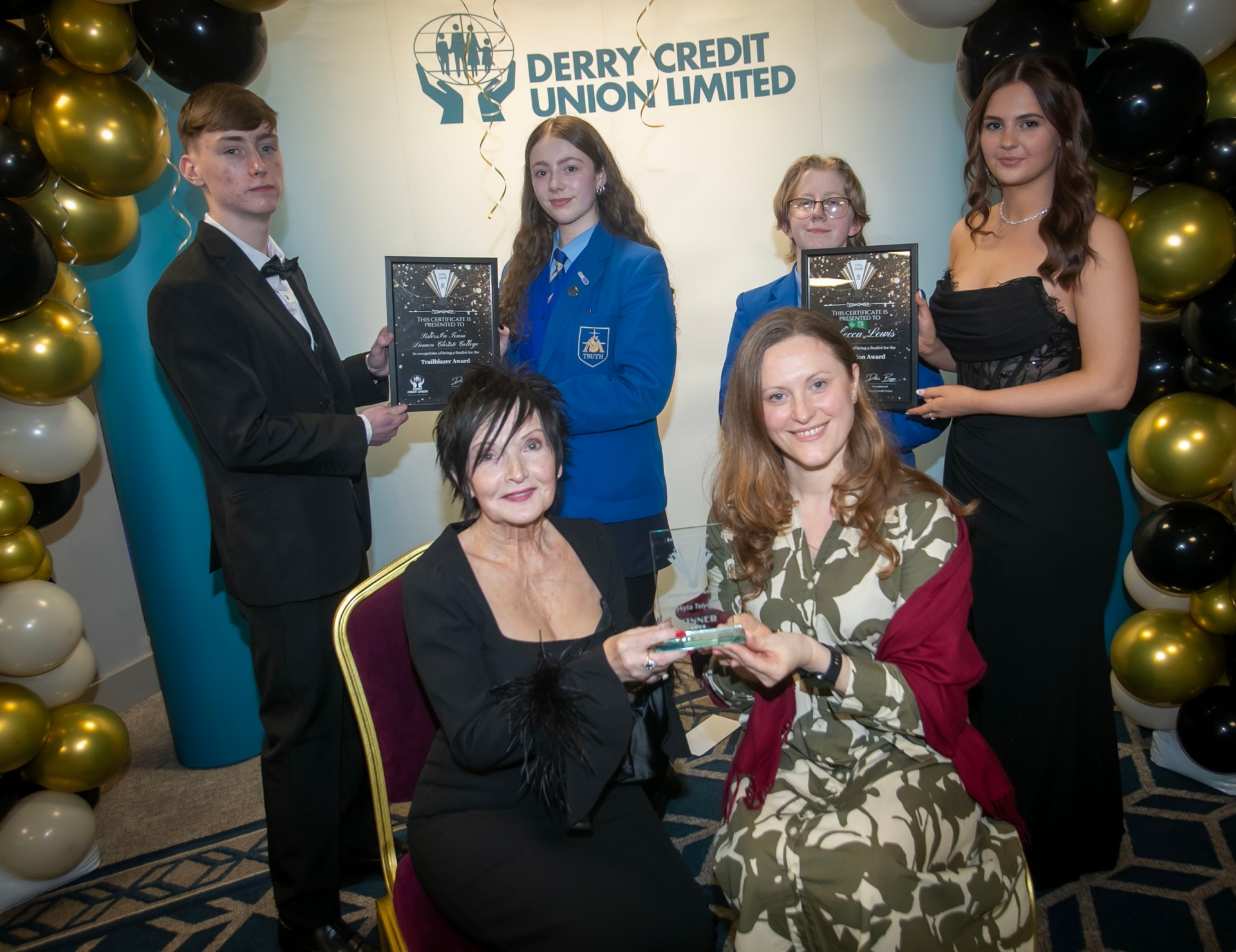 Patricia Doherty, Vice President, Irish League of Credit Unions presenting the 'Innovation Award' to the mother of Mykyta Telychko (unable to attend) at Monday night's awards ceremony. At back are runners-up Eimear McGowan and Rebecca Lewis receiving their certificates from Cian McLaughlin and Sarah Doherty, Youth Committee members.