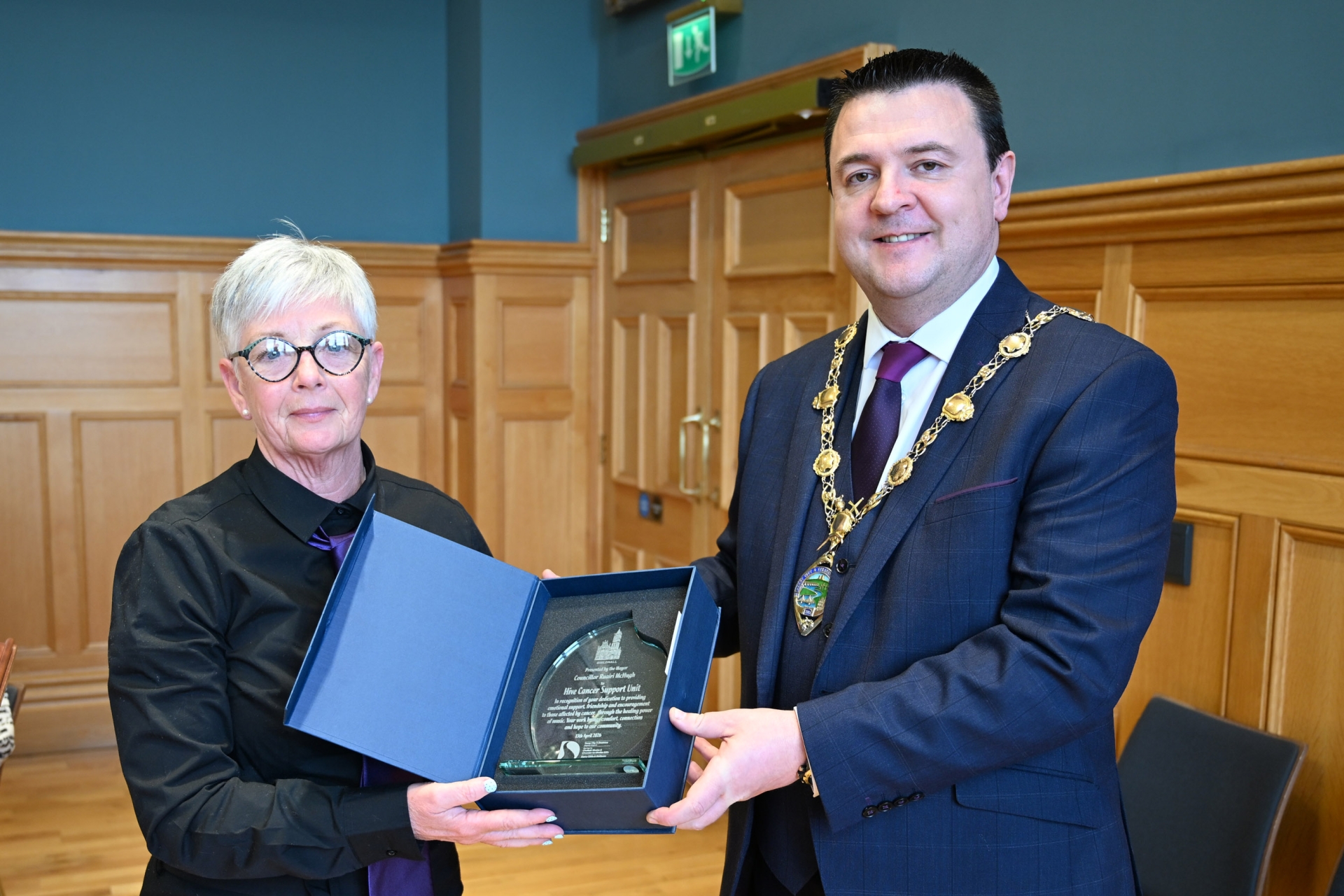 Jacquie Loughrey accepts a commemorative crystal gift from the Mayor Councillor Ruairi as he hosted a reception for members of the Hive Cancer Support Unit choir who recently represented Derry and the wider community by taking part in Curfá a TG4 television series that searches for the best choir in Ireland.