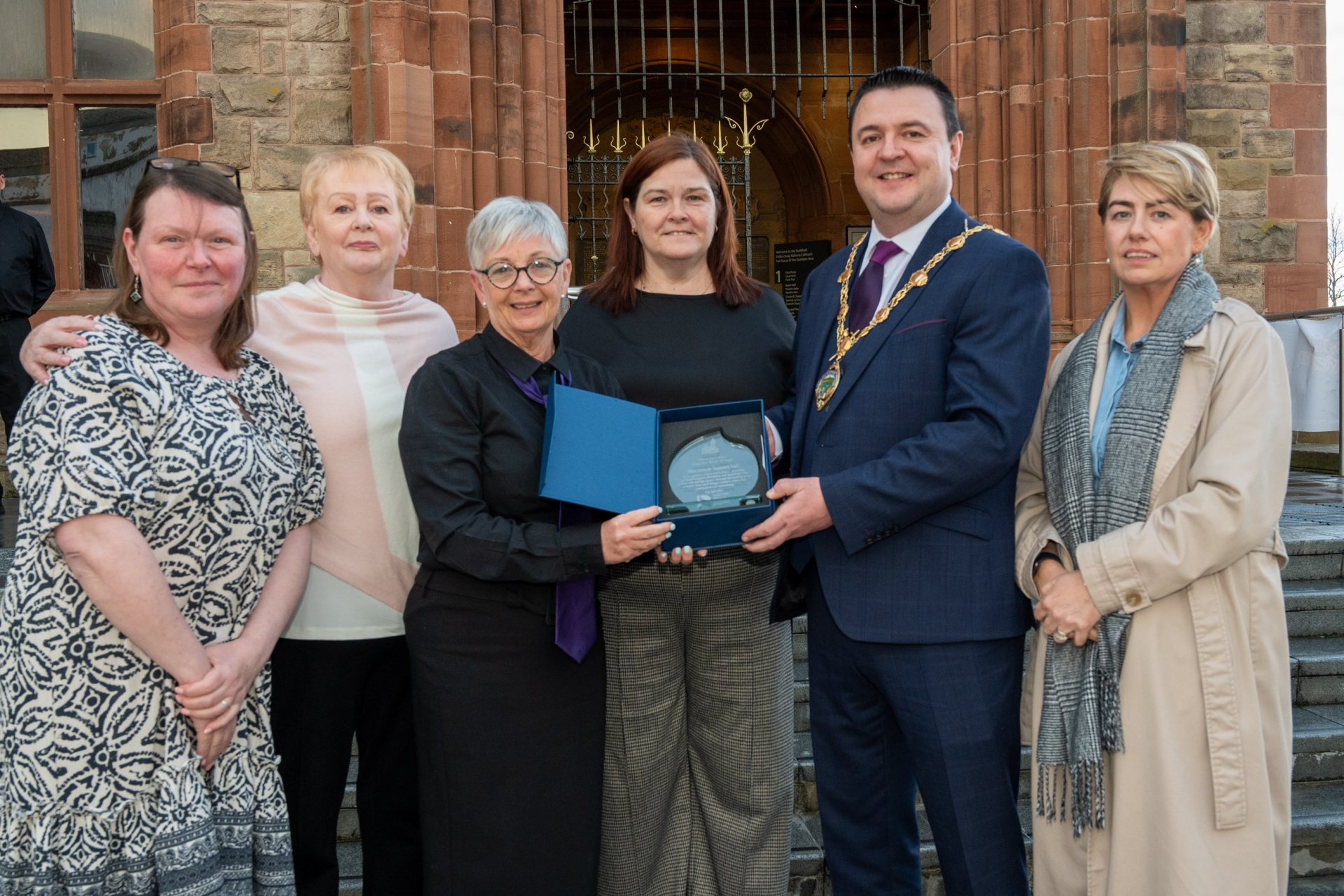 The Mayor pictured with the Hive Allotment group, Theresa Kelly, Angela O'Donnell, Maureen Collins, Hive Project Manager and Anna McKinney. (Photos: Martin McKeown)