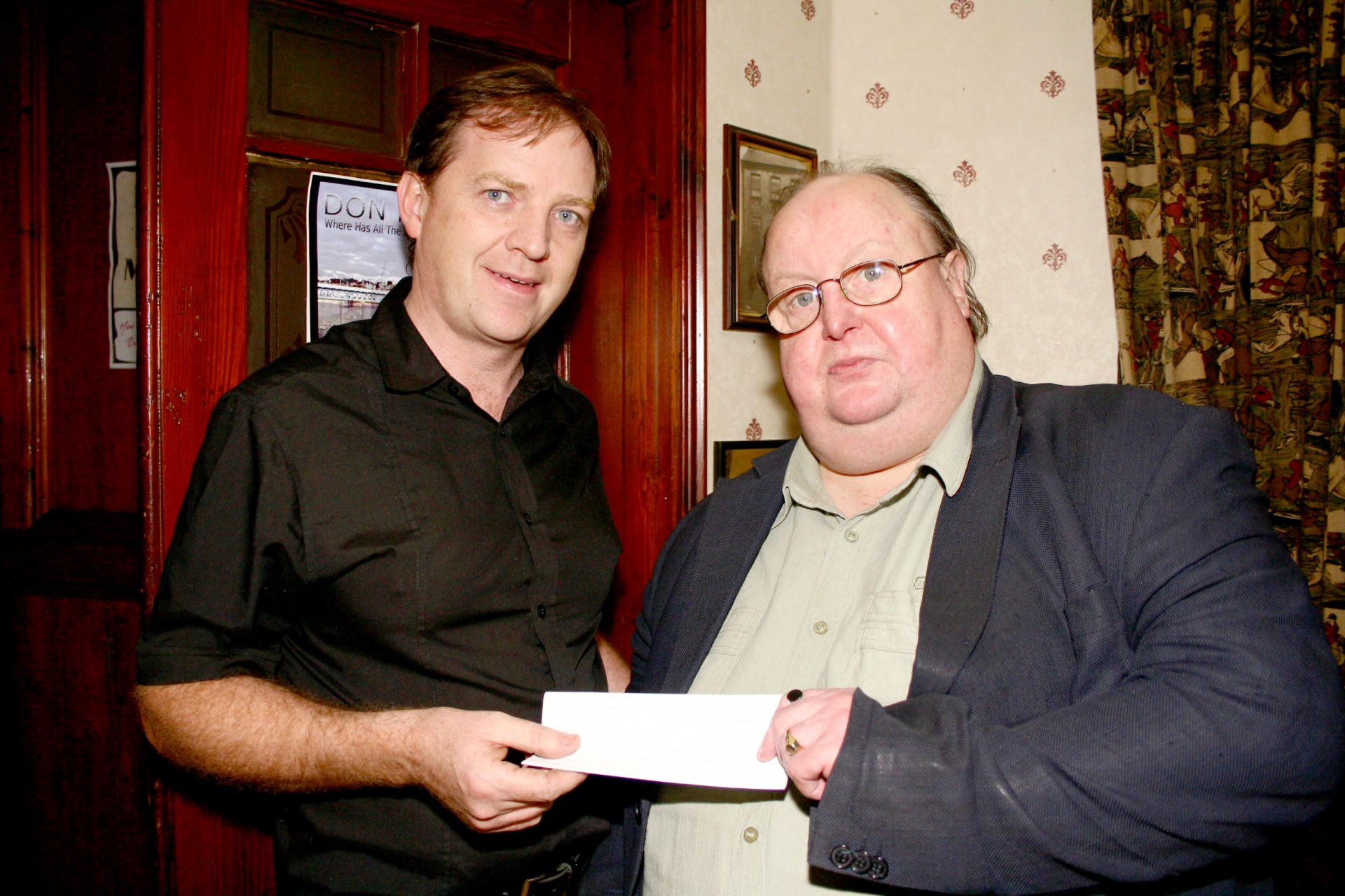 Bowery Bar proprietor Patsy McGilloway pictured handing over a cheque to Kenny "The Big Dote" Stevenson, proceeds from the Country Fever charity night at the Bowery Bar, in aid of Glenside ABC.