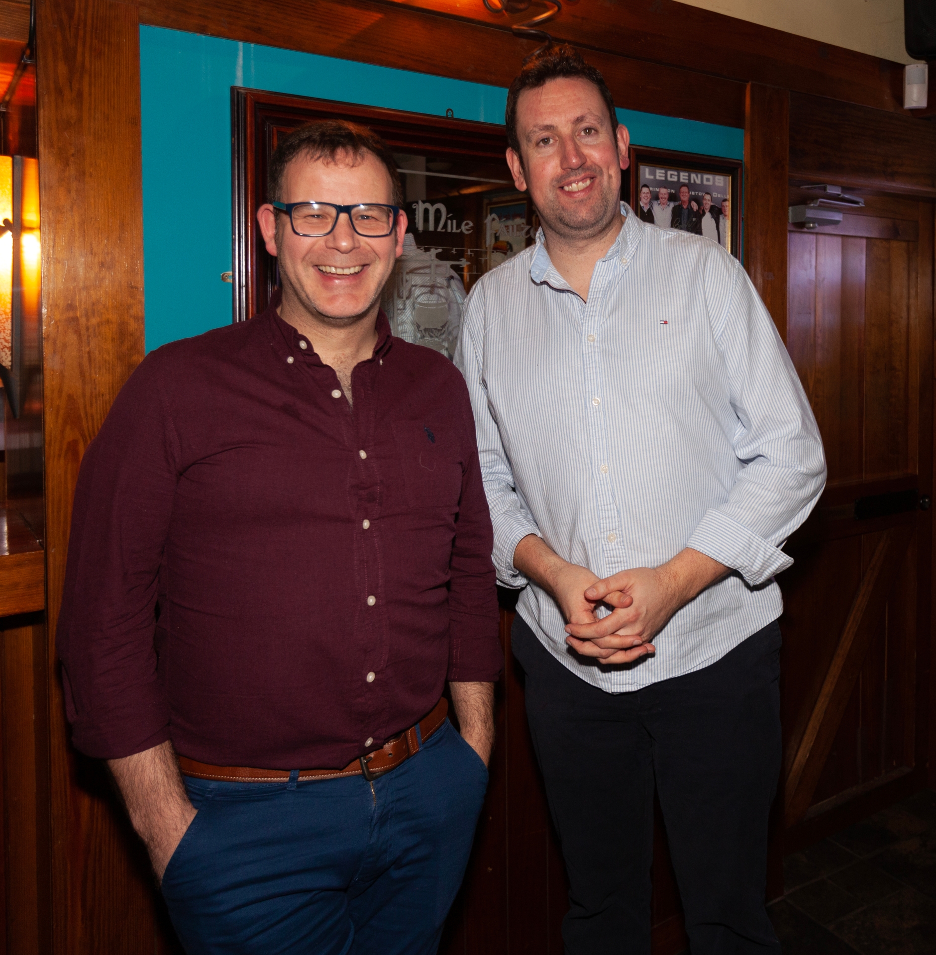 Musicians John Larkin and Brendan Travers relax before performing at the Kieran Whelan tribute night