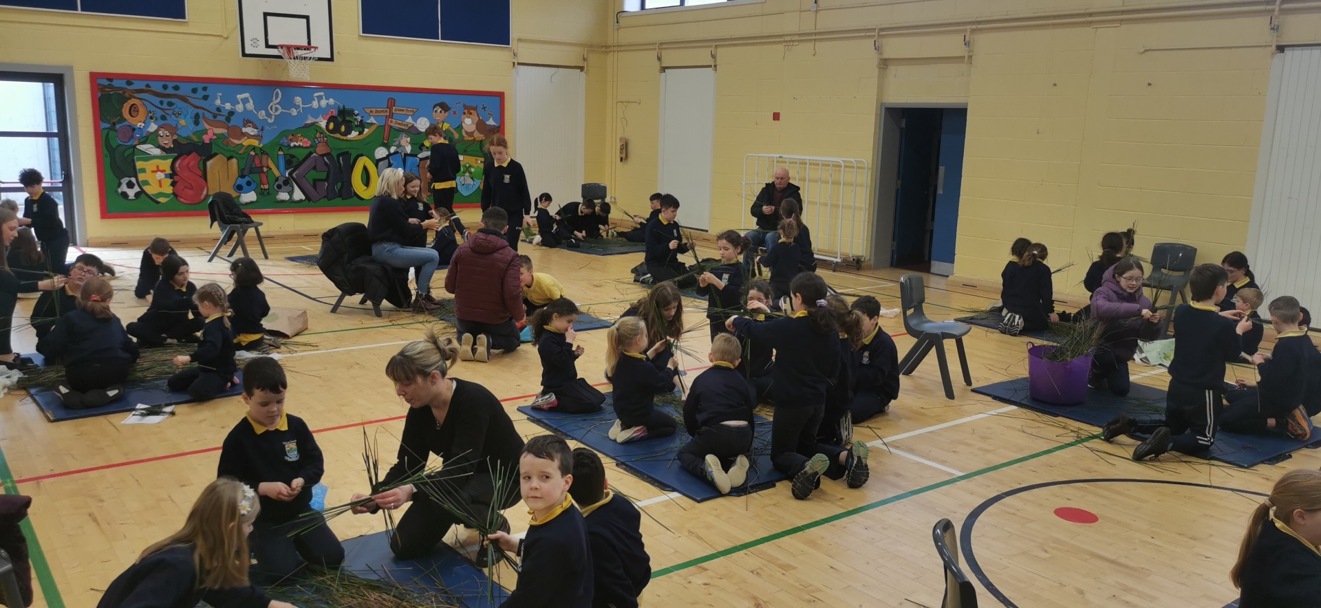 Scoil Náisiúnta an Choimín pupils and their relatives busy making St Bridgid's crosses in the school hall.