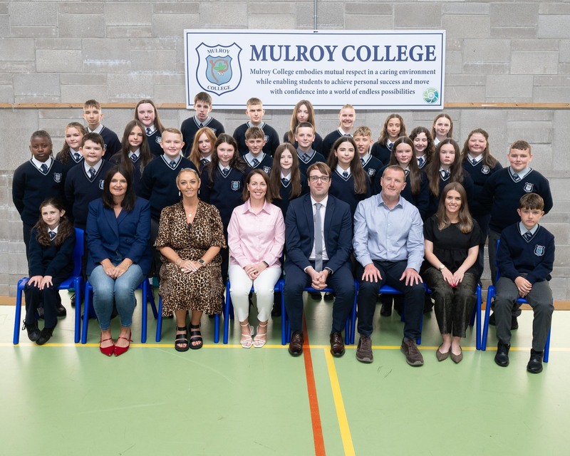 Mulroy College 1st Years 2025. Rang Ailbhe with seated Angela Mc Daid, Class Teacher, Class Teacher, Assistant Year Head Trudy O'Donnell, Deputy Principal, Amanda Quinn, Principal, David Mc Hale, Year Head, Darragh Kelly and SNA Nikita Doherty, Photo Clive Wasson