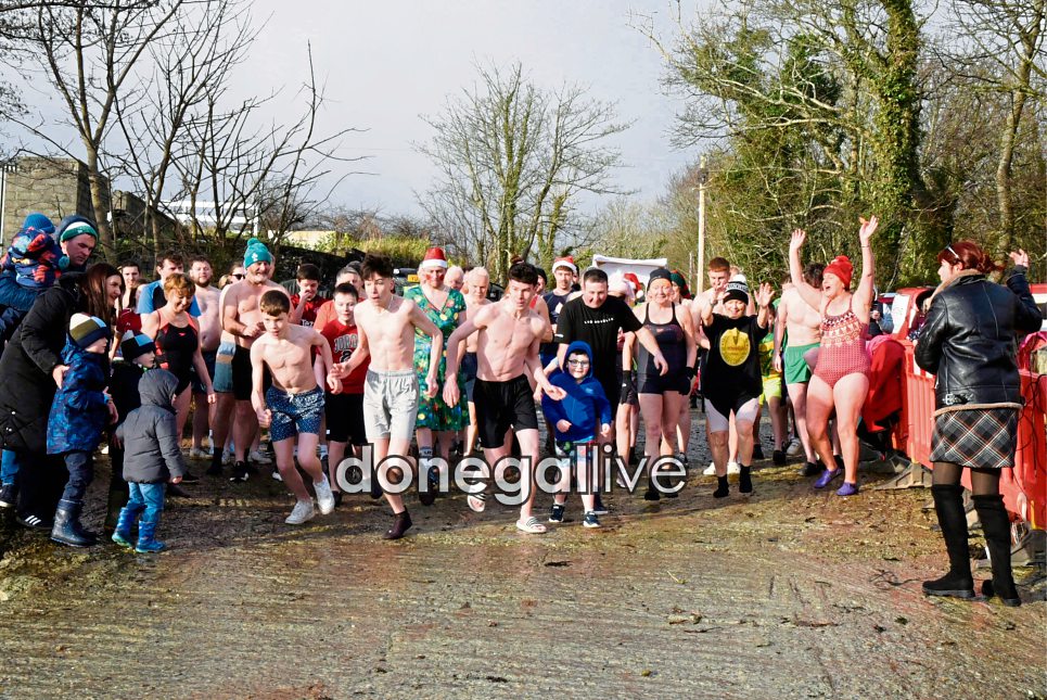 The annual New Year's Day Swim in Redcastle was held in memory of Redcastle Postmistress Elizabeth Hannon and in aid of Donegal Cancer Care West