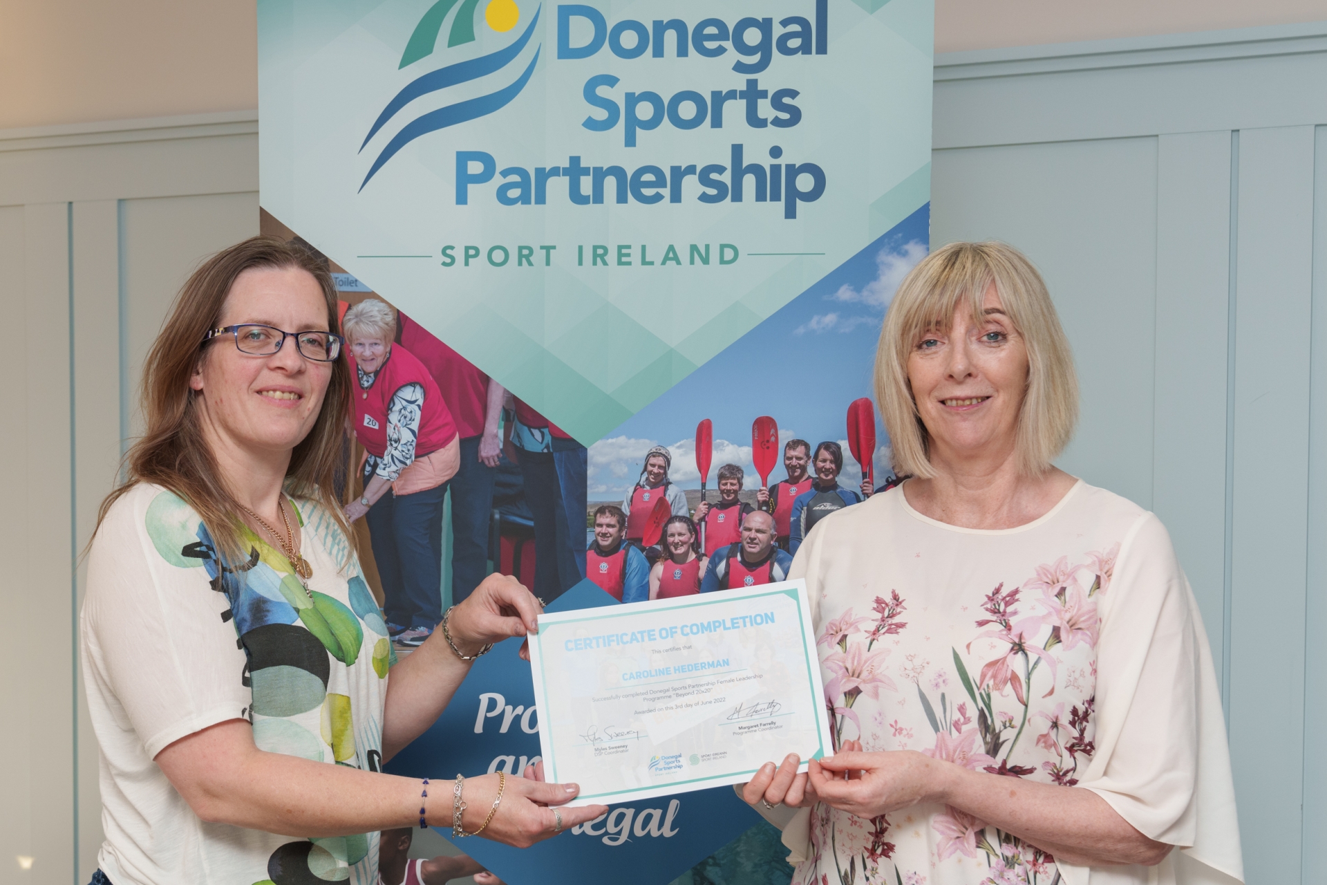 Caroline Hederman being presented with her certificate by Margaret O'Donnell from Donegal Sports Partnership