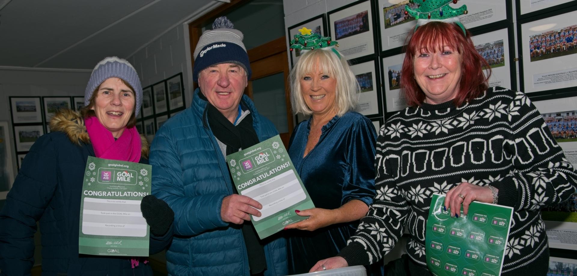 Mary and Dermott Sinnott collect their ‘Certs’ with Dee Shaw and Caroline Healy looking after the registrations at Naas GOAL Mile, Christmas Day, at Naas GAA, Thursday, December 25, 2025