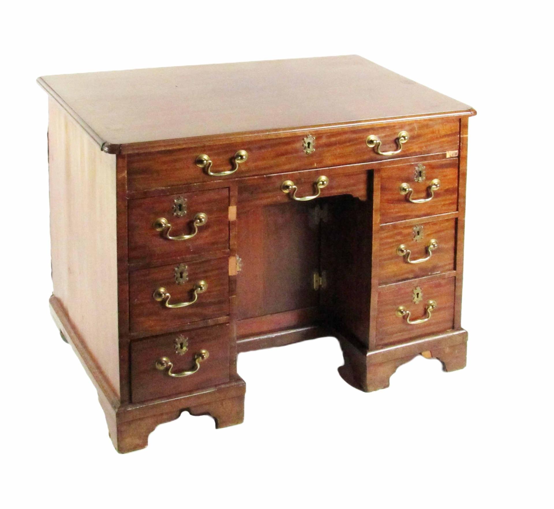 A Georgian period mahogany Gentleman's kneehole Desk, of rectangular shaped moulded top above a long frieze drawer with brass handles, kneehole compartment flanked either side by three narrow drawers with matching handle, on bracket feet, approx. 84cms wide x 71cms high x 53cms deep (33" x 28" x 21"). (1) 500 / 600