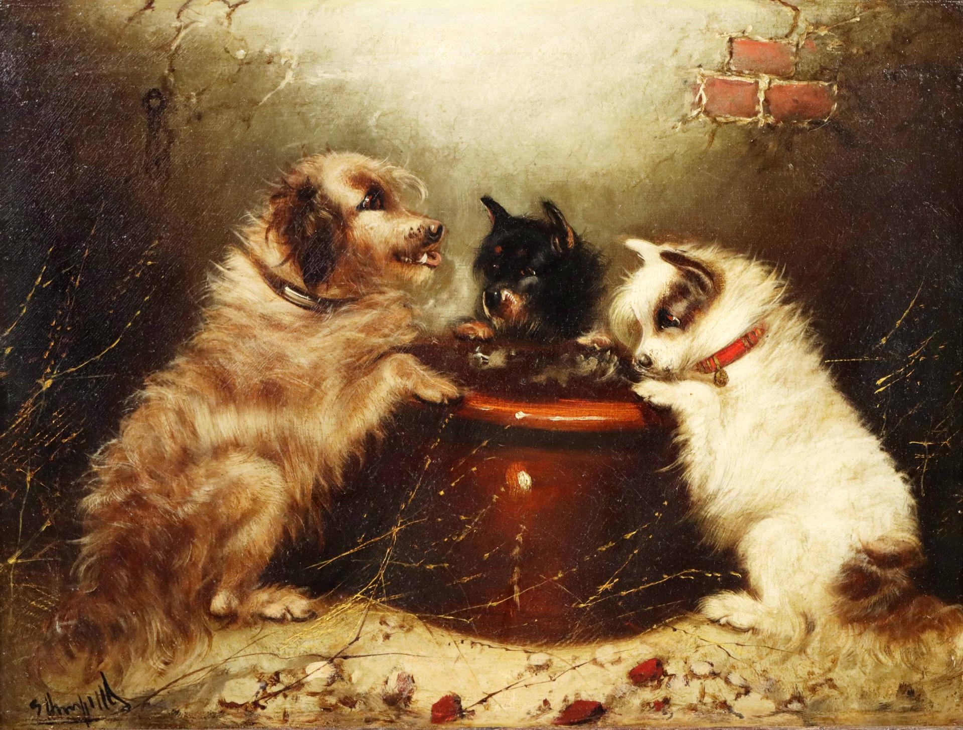 "Terriers Resting in a Stable" O.O.C., Signed lower right, 25cms x 34cms (10" x 13 1/2"), and its companion "Terriers Ratting in a Barn" a pair. (2) 600 / 800