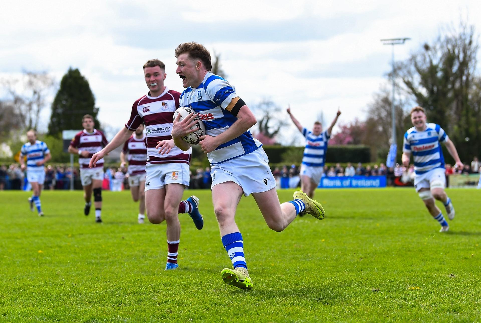 19 April 2026; Ciaran Fennessy of Athy RFC crosses the line to score the first try against Tullow RFC during the Bank of Ireland Provincial Towns Cup Final match between Athy RFC and Tullow RFC at Edenderry RFC in Edenderry, Offaly. Photo by Matt Browne/Sportsfile